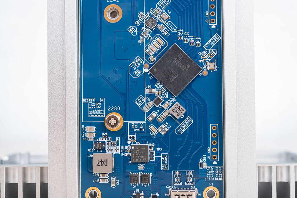 內部電路板上,主要的控制晶片為 Barlow Ridge (JHL9480),這顆就是 Intel 最新的 Thunderbolt 80/120G 控制器,這顆控制器支援 USB4 v2 的規格,PCIe 模式下可提供 Gen4 x4 64Gbps 的傳輸能力。但是無法向下支援一般 USB-C 連接使用。負責處理 USB-PD 供電的則使用 CYPM1321 這顆 MCU。