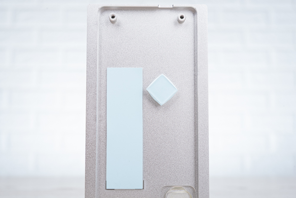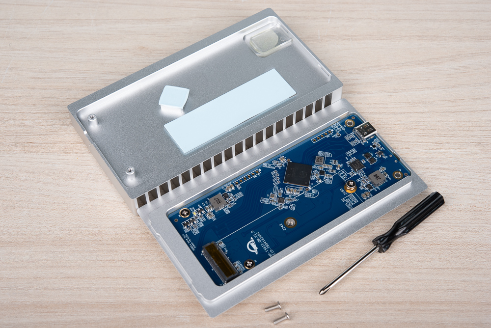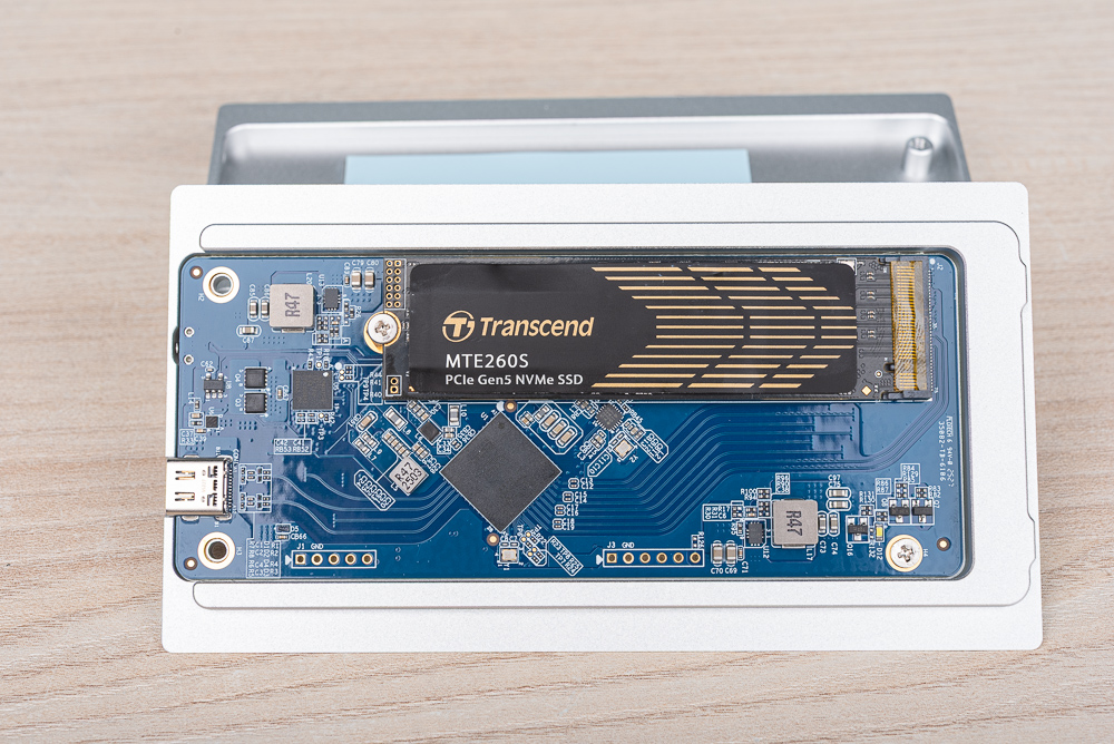 散熱方面,外接盒上蓋備有導熱墊可替 SSD 正面與控制器散熱;本次測試則使用 Transcend PCIe Gen5 SSD MTE260S。而安裝好 SSD 之後鎖回上蓋,在配件中有額外的橡膠墊可讓玩家使用。