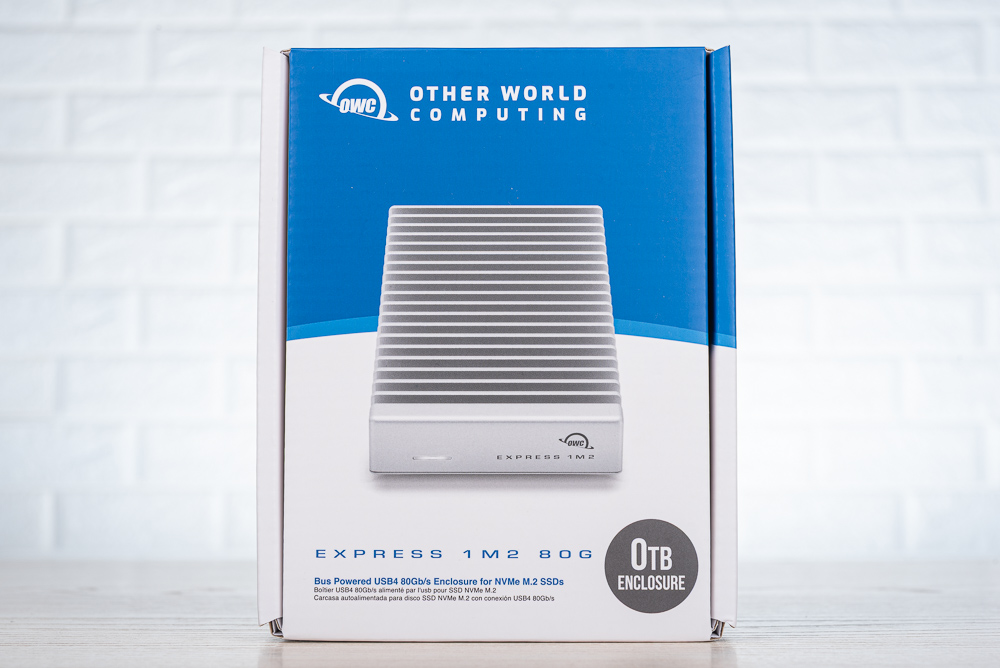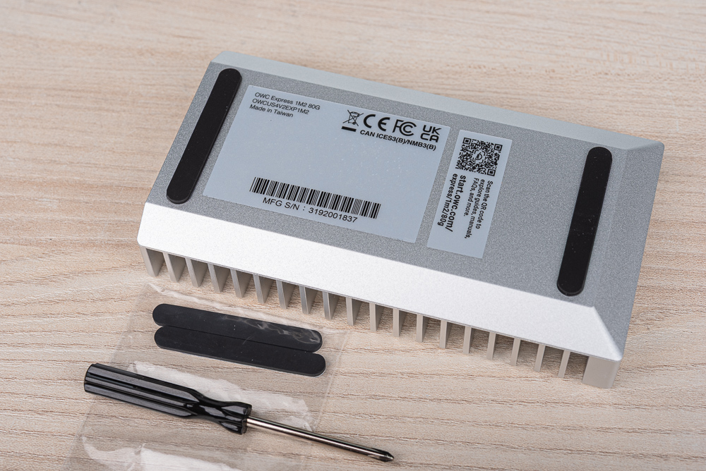 OWC Express 1M2 80G 的外包裝、產品外觀與原本的 OWC Express 1M2 一致,這款造型繼承至自家「ThunderBlade」的專業造型,Express 1M2 80G 鰭片鋁合金的外殼尺寸為 13.2 x 7.0 x 2.4 cm 相比一般 SSD 外接盒還要大了許多,但可給予 SSD 更好的被動散熱性能。
