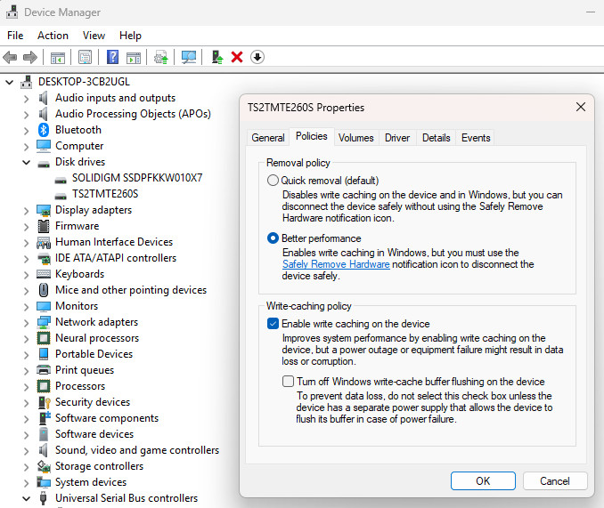 ↑ 初次使用建議可改為最佳效能,但要注意的是移除裝置時一定要安全移除。