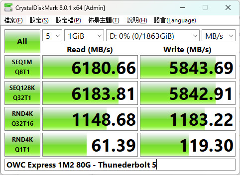 OWC Express 1M2 80G 連接至 Thunderbolt 5 PC,通過 CrystalDiskMark 進行測試循序讀取 1M Q8T1 可達到 6180 MB/s、寫入 5843 MB/s 的效能,這外接速度基本上已非常接近內接 M.2 PCIe 4.0 x4 的傳輸效能,也是目前外接 SSD 最高的傳輸能力。
