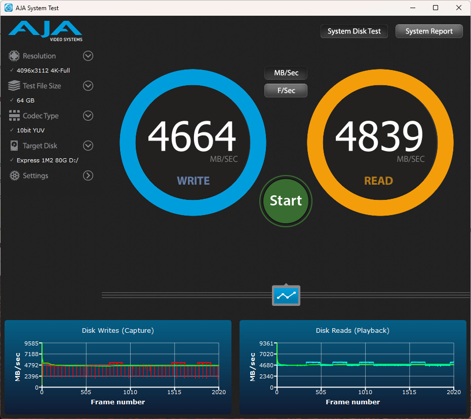 AJA System Test 模擬 4K FULL 64GB 影像傳輸,循序讀取 4839 MB/s、寫入 4664 MB/s 的傳輸表現。