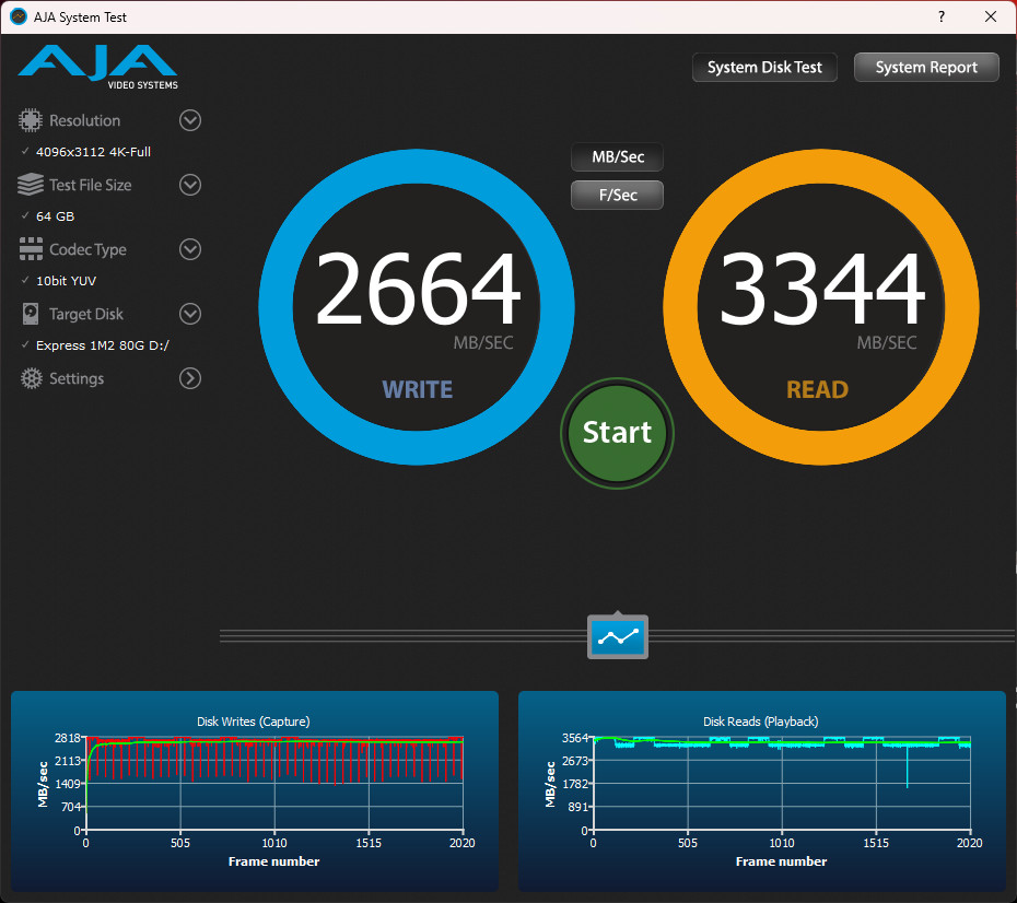 AJA System Test 模擬 4K FULL 64GB 影像傳輸,循序讀取 2664 MB/s、寫入 3344 MB/s 的傳輸表現。