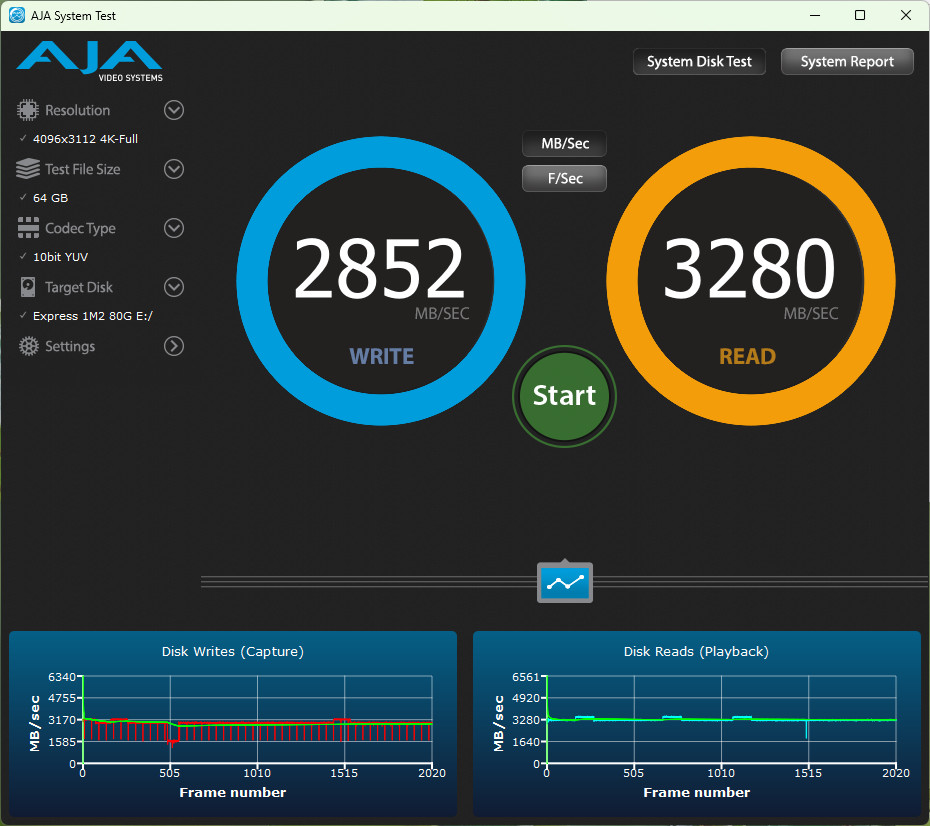 AJA System Test 模擬 4K FULL 64GB 影像傳輸,循序讀取 3280 MB/s、寫入 2852 MB/s 的傳輸表現。