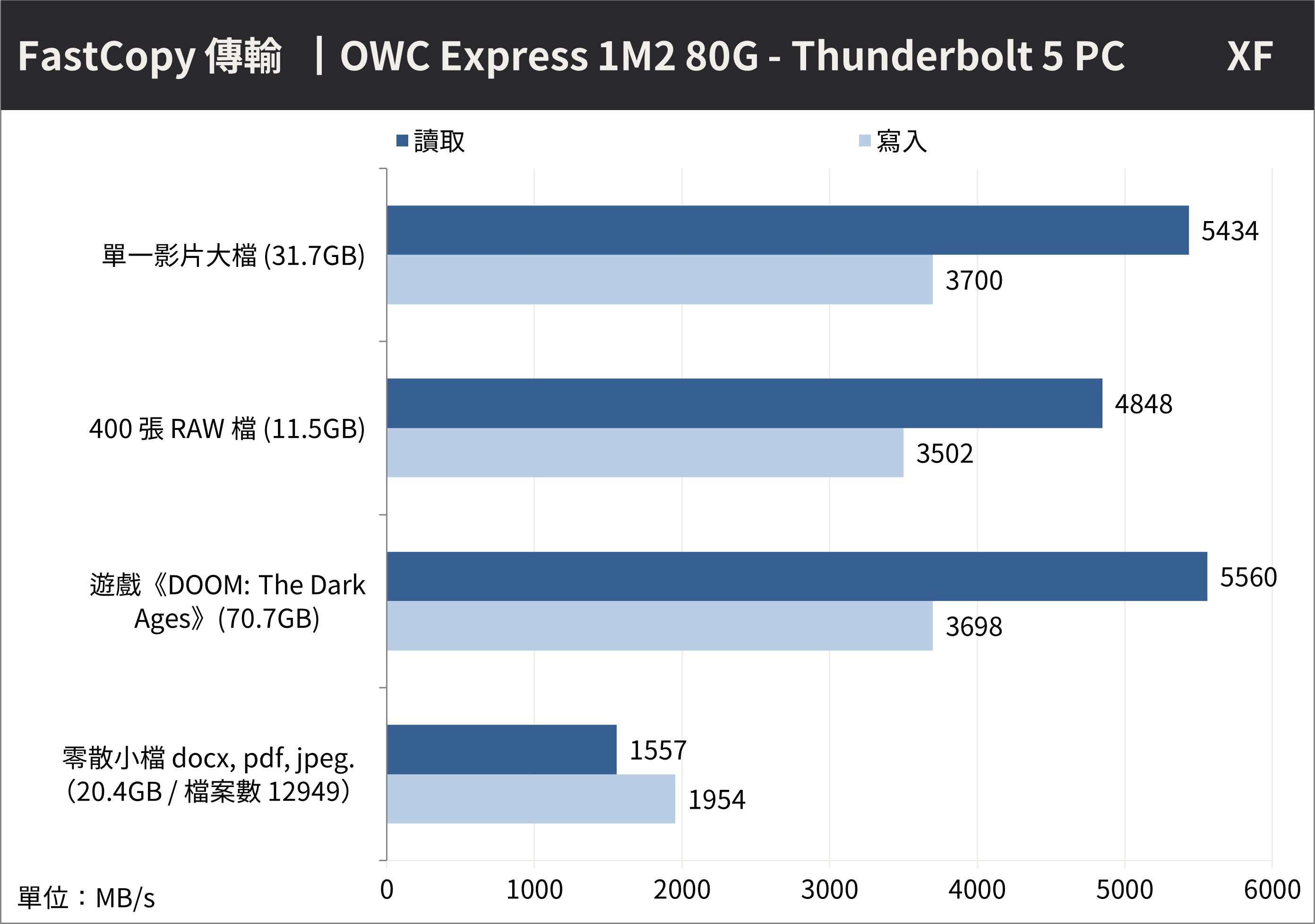 OWC Express 1M2 80G 傳輸單一影片大檔讀取可達 5434 MB/s、寫入 3700 MB/s;RAW 檔照片則是讀取 4848 MB/s、寫入 3502 MB/s;遊戲資料夾複製讀取 5560 MB/s、寫入 3698 MB/s;零散小檔讀取 1557 MB/s、寫入 1954 MB/s。