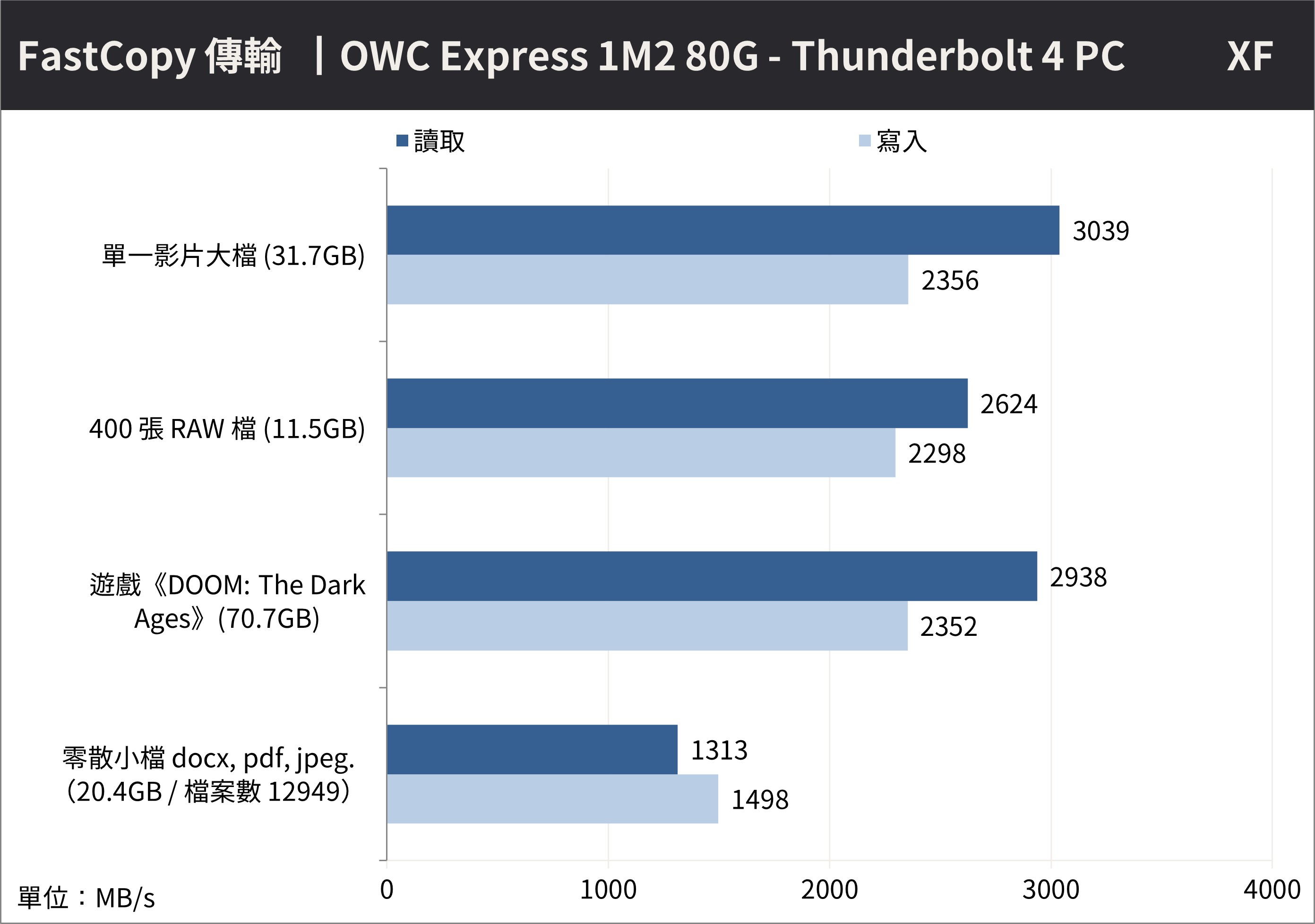 FastCopy 測試,OWC Express 1M2 80G 傳輸單一影片大檔讀取 3039 MB/s、寫入 2356 MB/s;RAW 檔照片則是讀取 2624 MB/s、寫入 2298 MB/s;遊戲資料夾複製讀取 2938 MB/s、寫入 2352 MB/s;零散小檔讀取 1313 MB/s、寫入 1498 MB/s。