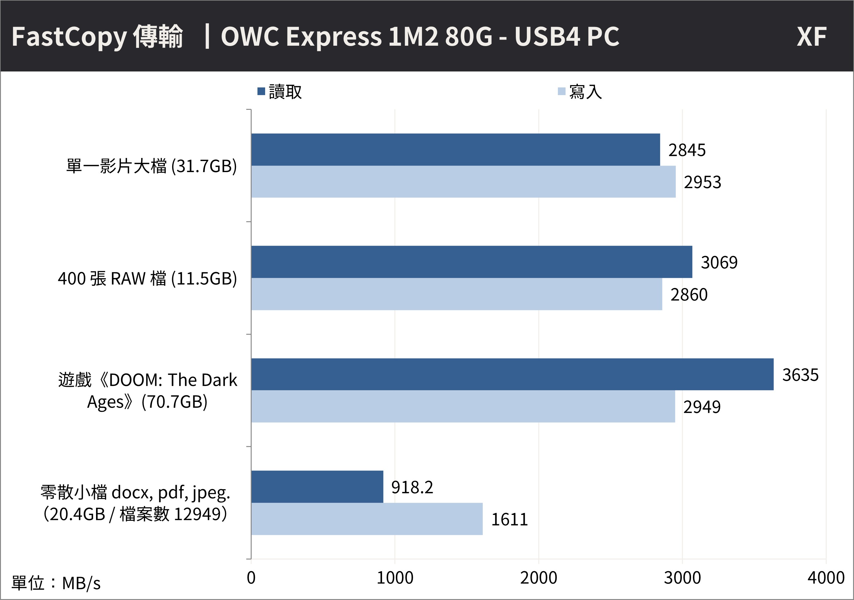 FastCopy 測試,OWC Express 1M2 80G 傳輸單一影片大檔讀取 2845 MB/s、寫入 2953 MB/s;RAW 檔照片則是讀取 3069 MB/s、寫入 2860 MB/s;遊戲資料夾複製讀取 3635 MB/s、寫入 2949 MB/s;零散小檔讀取 918.2 MB/s、寫入 1611 MB/s。