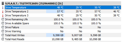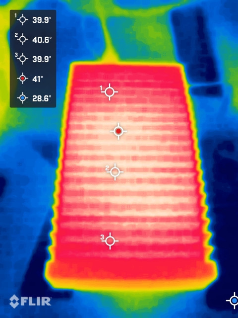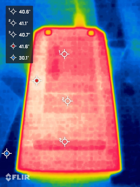 通過 CrystalDiskMark 測試 HWINFO 偵測到內部的 MTE260S SSD 最高溫度來到 57°C,測試環境為無風扇散熱、室溫冷氣房 26°C 的情況下。而熱像儀顯示,OWC Express 1M2 80G 外接盒正面最高 41°C、背面最高也是 41°C,這溫度表現不太需要擔心過熱降速,但如果是長時間大檔案高速傳輸的情況下,有好的通風或室內冷氣會比較好。