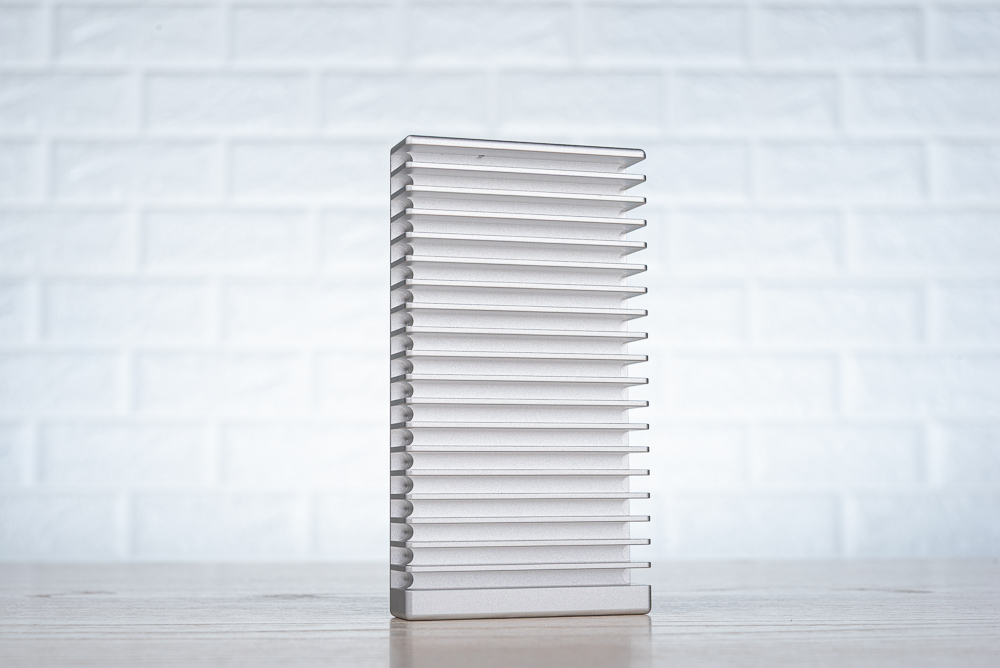 OWC Express 1M2 80G 有著精工削切的鋁合金外殼,洗鍊的鰭片造型與圓潤的四角,讓 SSD 外接盒有著相當獨特的外觀與專業感。在外接盒正面有著燈號指示燈與 OWC Express 1M2 字樣,後方則有著 USB4 80Gb/s Type C 連接埠。