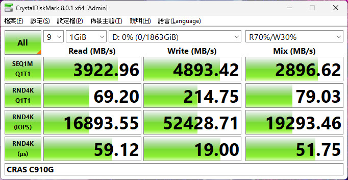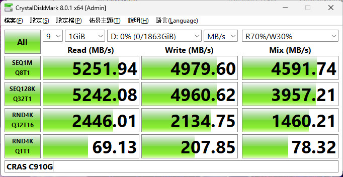 CrystalDiskMark 測試預設 +Mix、NVMe 隨機模式,CRAS C910G 2TB 可達到循序讀取 5251.9 MB/s、寫入 4979.6 MB/s,隨機 RND4K Q32T16 讀取 2446 MB/s、寫入 2134.7 MB/s 的效能表現。