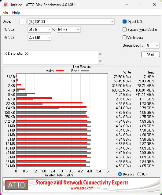 ATTO Disk Benchmark 使用不同 I/O 大小來測試裝置最大性能,在 Direct I/O 佇列 8 層測試,CRAS C910G 2TB 讀寫最大值可達到 4.90 GB/s、4.64 GB/s。對於不同 I/O Size 操作下都能有著穩定的讀寫效能。