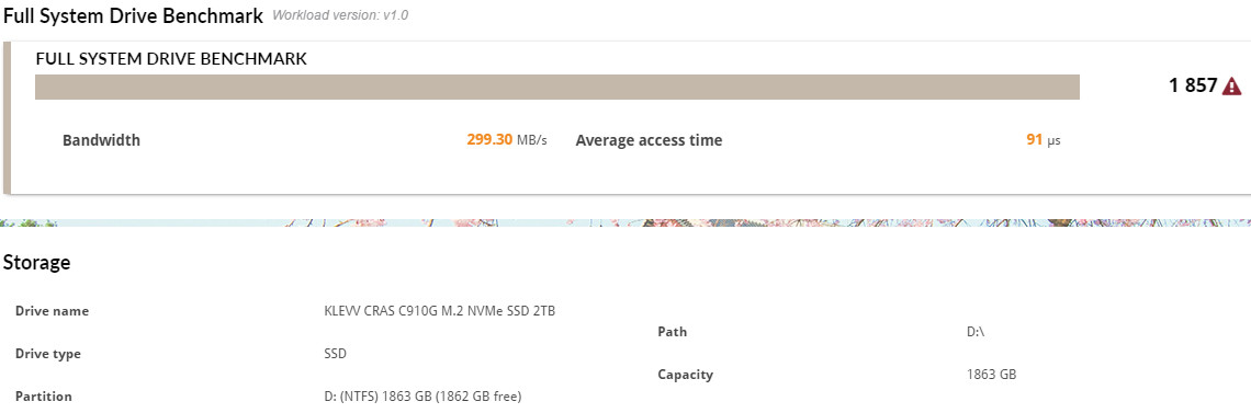 CRAS C910G 2TB 獲得 1857 分的成績,可達到 299.3 MB/s 的平均頻寬,存取時間平均僅 91µs微秒。