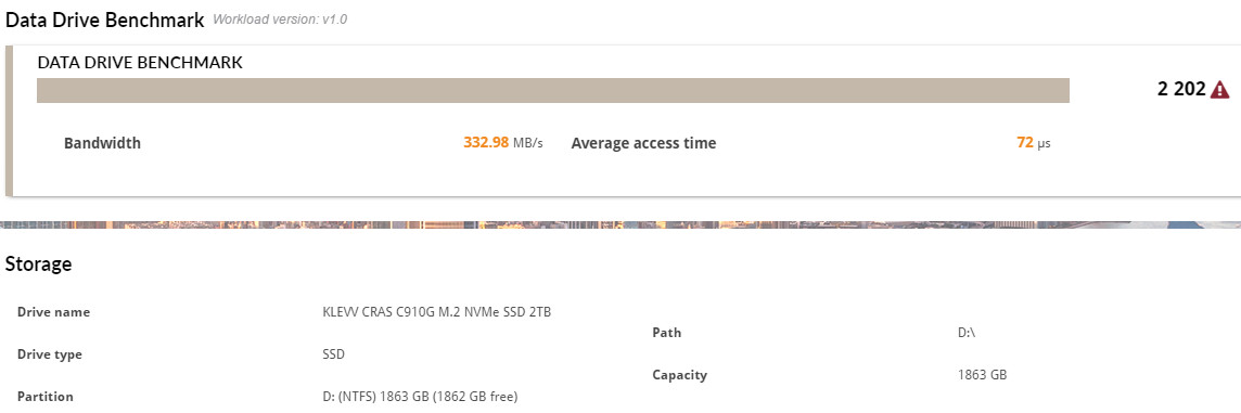 Data Drive Benchmark 則是模擬資料碟的小檔案傳輸效能測試,可做為 NAS、USB 與記憶卡等儲存裝置的測試項目。這項目 CRAS C910G 2TB 獲得 2202 分的成績,平均頻寬有著 332.98 MB/s、平均存取時間 72µs。