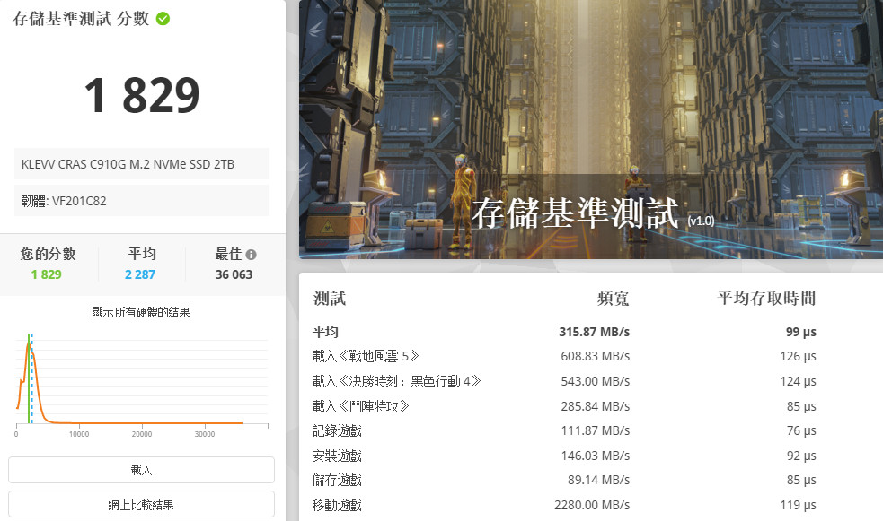 CRAS C910G 2TB 獲得 1829 分的成績,可達到 315.87 MB/s 的平均頻寬,存取時間平均 99µs微秒,讓玩家有著非常快的載入遊戲速度。