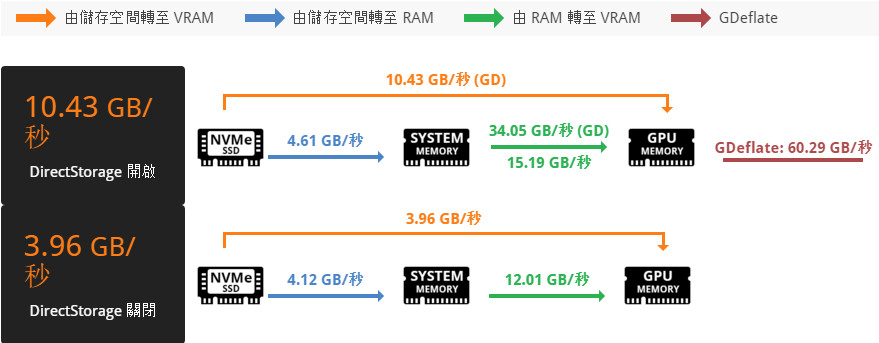 ↑ DirectStorage 開啟 NVMe SSD 傳輸至 GPU 視訊記憶體頻寬可達到 10.43 GB/s。