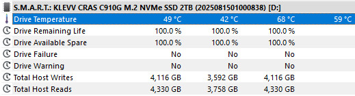 KLEVV CRAS C910G M.2 SSD 做為 PCIe 4.0 x4 SSD 不僅有著循序讀寫 5251.9 MB/s、 4979.6 MB/s 的傳輸表現,更升級石墨烯銅箔散熱片,即便裸碟使用下最高溫度僅 68°C,倘若搭配主板 M.2 散熱片則有著更低的 49°C 溫度表現。