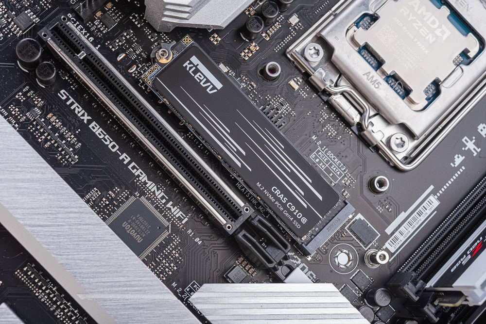 測試使用 AMD Ryzen 9 9950X3D 處理器與 ROG CROSSHAIR X870E HERO 主機板,將 KLEVV CRAS C910G M.2 2TB SSD 安裝於主機板的第一根 M.2 插槽,透過 CPU 提供的 PCIe 通道來測試,並加裝主機板的 M.2 散熱片搭配風扇散熱。