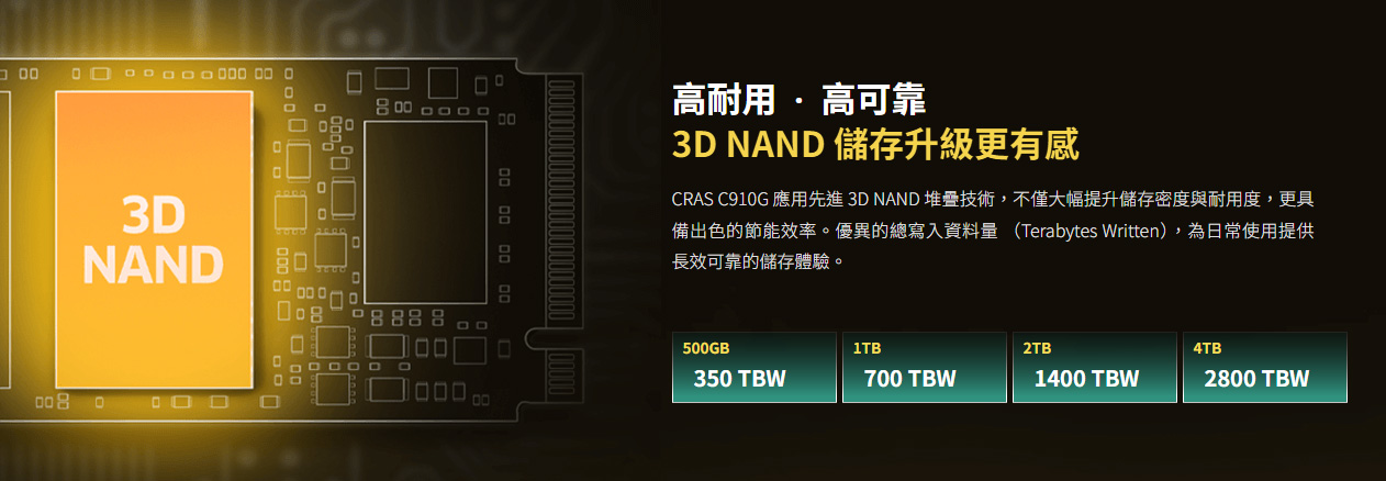 CRAS C910G 同樣採用 PCIe 4.0 x4 介面,採用無 DRAM 快取的 SSD 控制器,並具備模擬 SLC 快取技術,可達到循序讀寫 5200MB/s、4800MB/s 的傳輸效能;提供多種容量可選擇,從最入門 500GB、主力 1TB、大容量 2TB 甚至是最大 4TB 容量全都有。