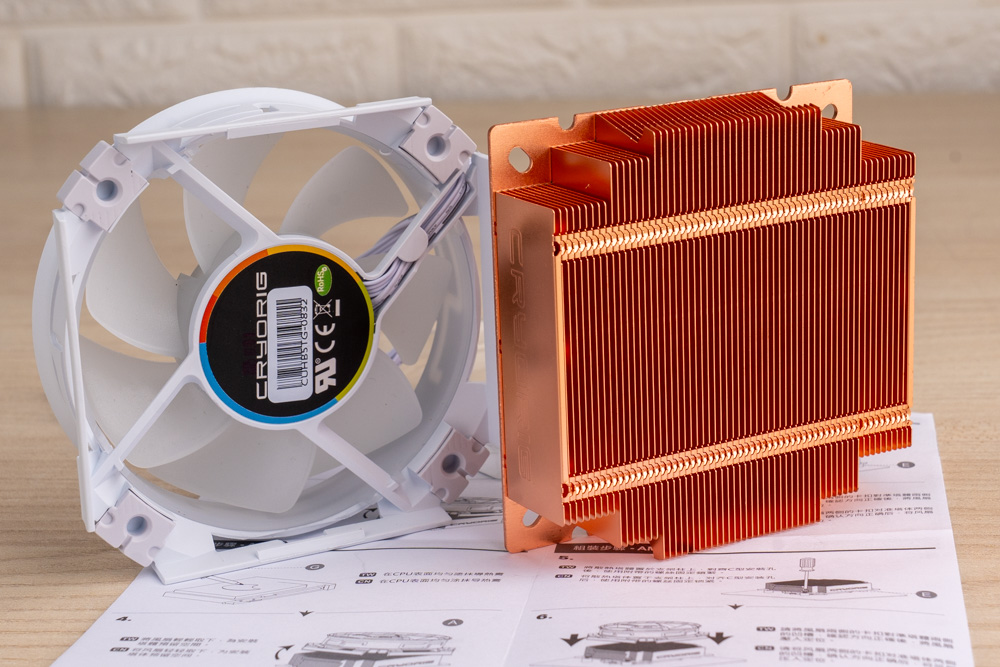 首先將主機板自帶的 AMD 原廠風扇扣具卸下,接者放上對應 AMD 腳位的紅色套筒,並使用出廠附的 CRYORIG 散熱膏,塗完壓上散熱器,根據安裝手冊與彈簧螺絲鎖法說明,將彈簧螺絲以輪流換鎖的交替方式,每轉1/3深度(圈)來依序鎖緊;最後裝上風扇,即完成散熱器安裝。