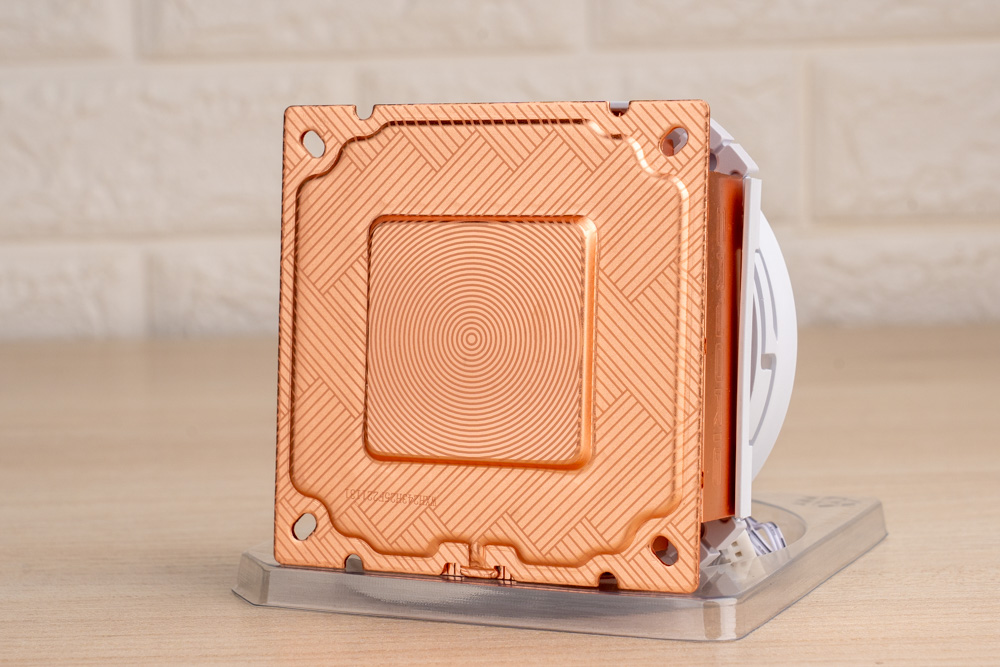 散熱底座,表面有著大面積的同心圓與菱形交錯的特殊紋理,正是源於 C5 Cu 採用的全銅VC均熱板銅底,藉由直觸 CPU 處理器,讓 CPU 熱量能均勻地迅速擴散於整面底座,並傳遞於下吹式鰭片組,經過風扇氣流導出,達到更完善冷卻過程。