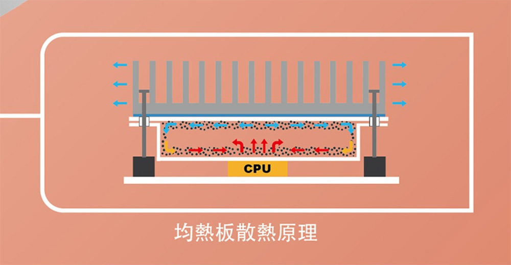 ↑ 透過均熱板將熱量均勻分布於整面底座,並傳遞給散熱鰭片導出。