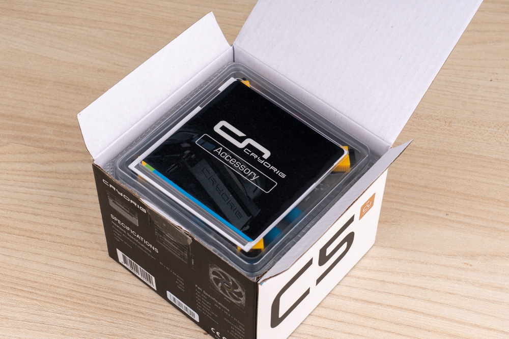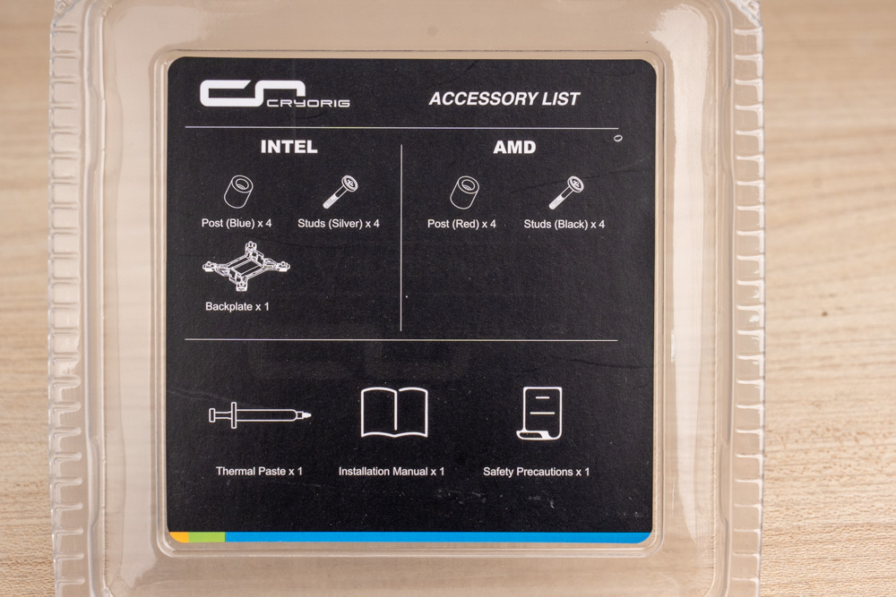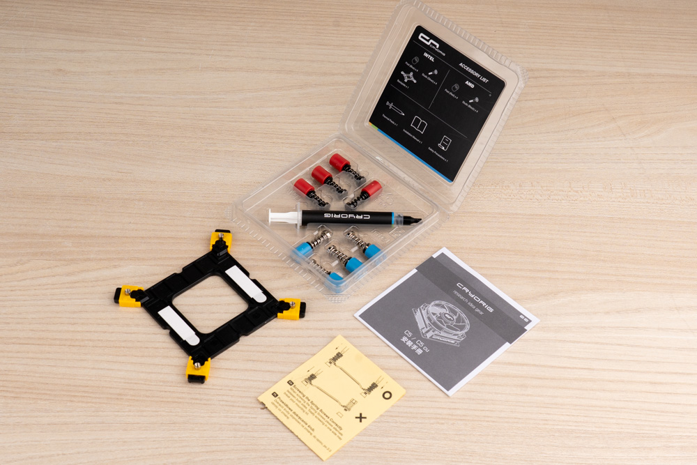 配件盒部分,標有簡單易懂的配件安裝清單,並提供有安裝手冊、彈簧螺絲鎖法說明書、Intel 安裝背板;以及各 CPU 腳位扣具組,設有紅、藍顏色來直觀區分AMD 與 Inter 平台,搭配下壓力極強的彈簧螺絲;更附贈有大容量的 CRYORIG 散熱膏,能夠用於日後多次安裝維護。