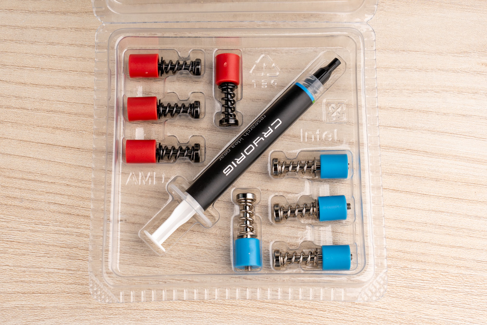 ↑ CPU腳位扣具組以紅、藍配色區分各家平台,並附贈大容量CRYORIG散熱膏。