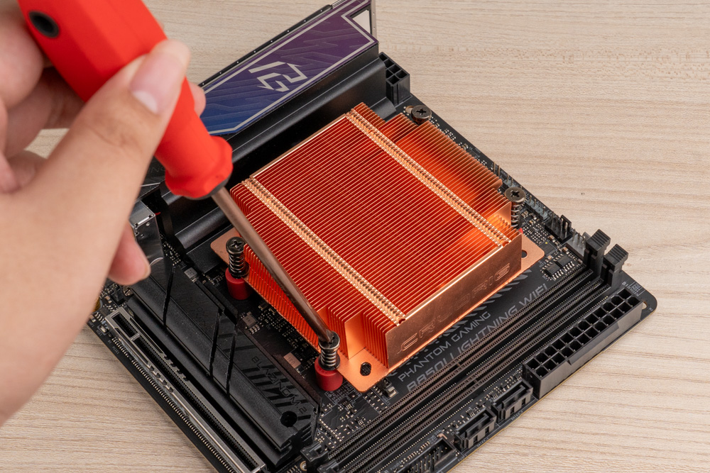 ↑ 以輪流換鎖方式,交替鎖緊彈簧螺絲來固定散熱器。