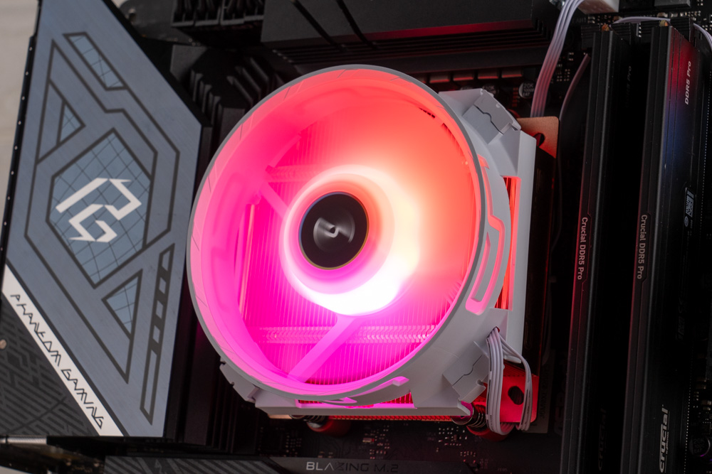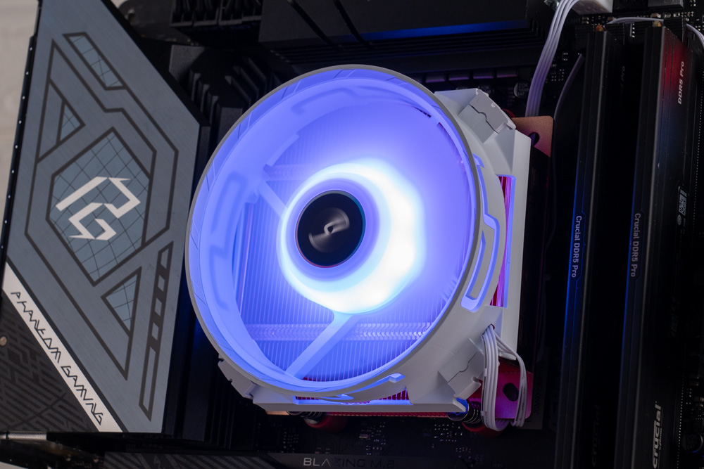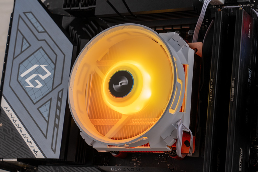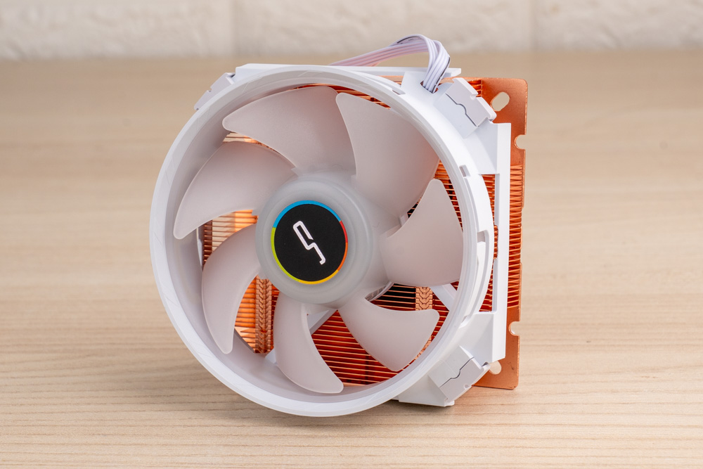 C5 Cu 空冷配有 96.8mm 規格 ARGB 風扇,具備高達 3200RPM 高轉速、51.81 CFM 風量與5.3 mmH2O 風壓的散熱性能,搭配風扇側邊鏤空輔助,能有效支援高導熱性的銅材散熱器。