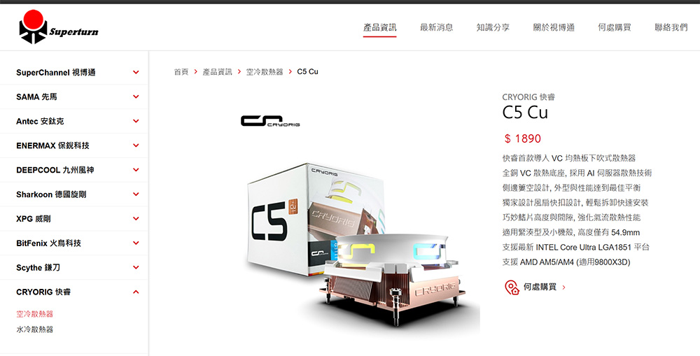 ↑ CRYORIG C5 Cu下吹式空冷散熱器,官方通路參考 。