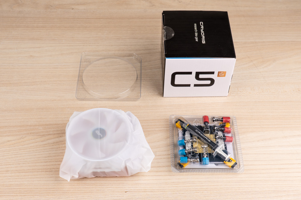 外盒內擺設,以緊湊堆疊放置於盒內,上下皆設有塑料殼來緩衝防護;內容物分別為配件盒、空冷本體等兩者;而配件盒中,包含安裝手冊、彈簧螺絲鎖法說明書、各CPU腳位扣具組。