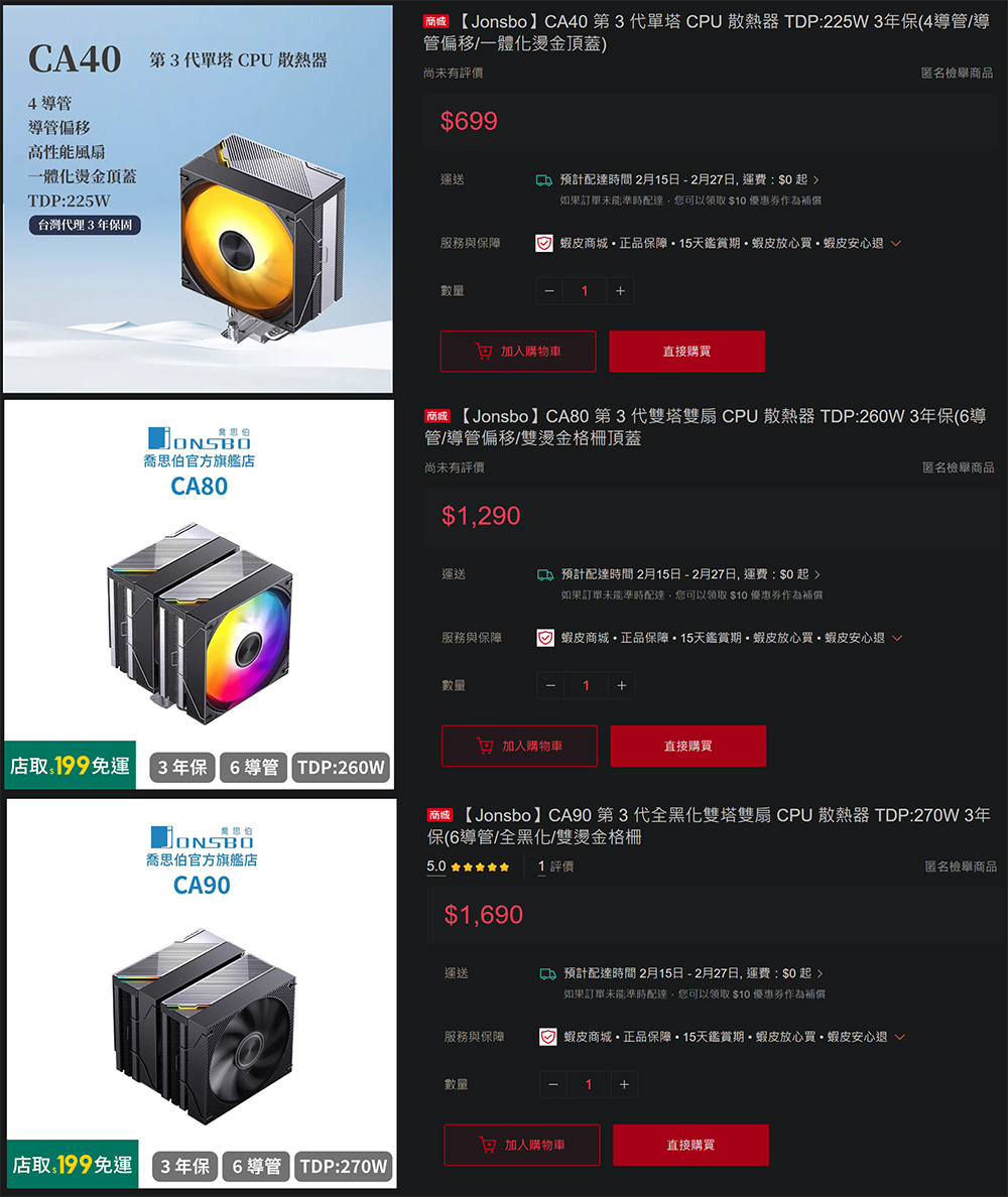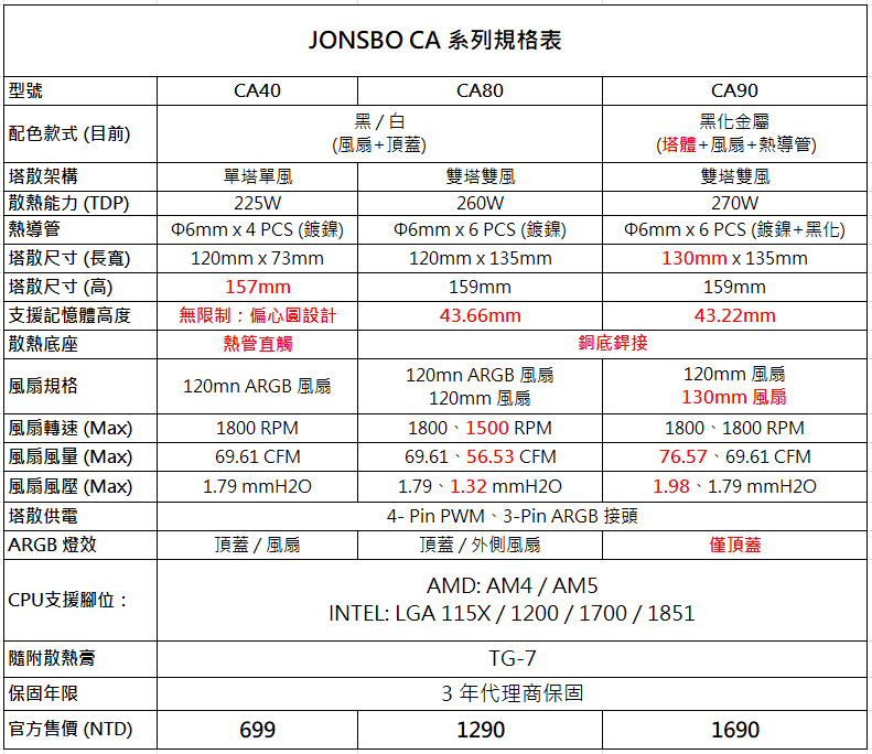 ↑ JONSBO CA系列散熱器,CA40、CA80、CA90 官方售價。