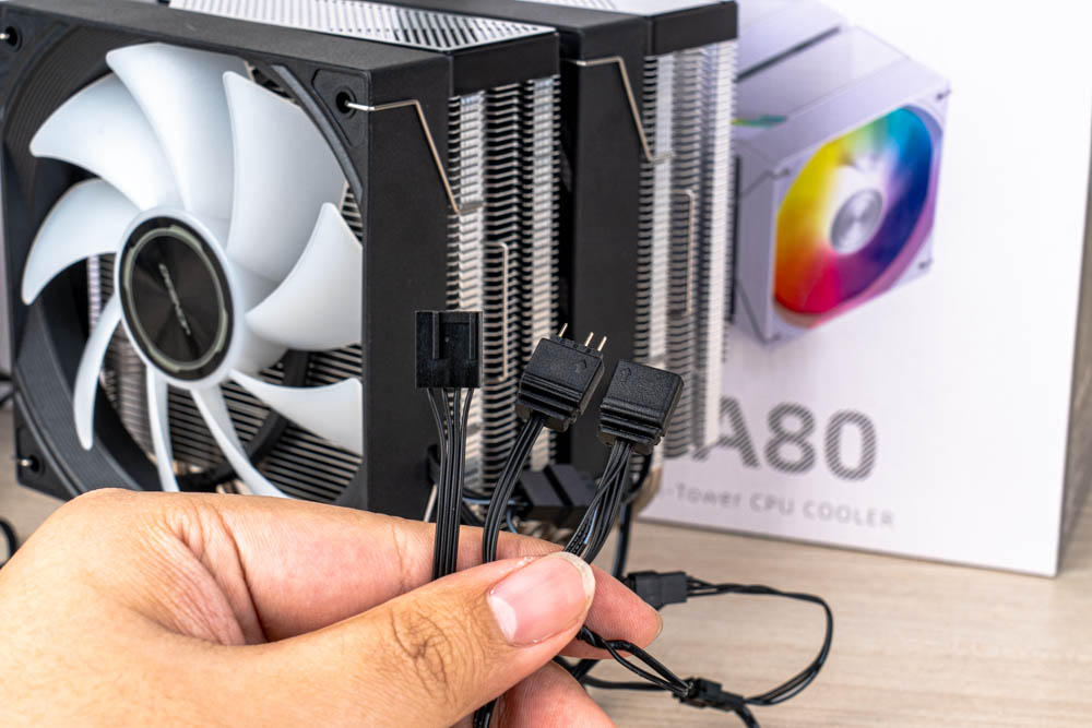 想看塔體全貌,得先接續拆卸風扇與連接線材;經拆解發現,三款散熱器在連接線材上,分別有著不同的設計方式,CA40採用風扇出線設計,由風扇包辦頂蓋的 ARGB 燈效串接;CA80 與 CA90則採用常見的 ARGB 連接線材,針對頂蓋與風扇 ARGB 燈效來串接。