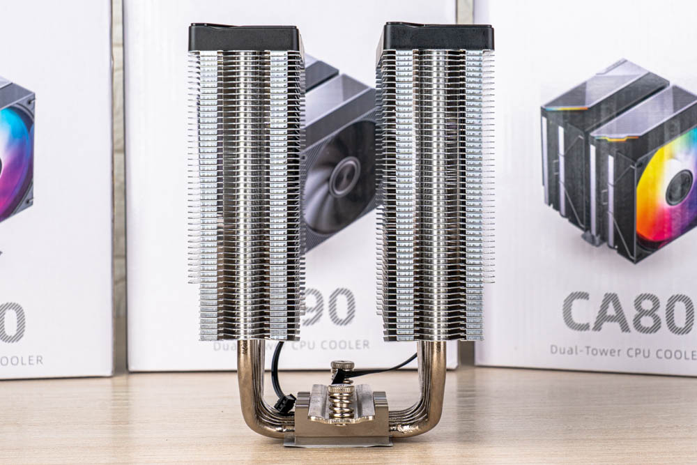 而 CA40 相較上述兩款,則採用單塔架構,搭配 4 根鍍鎳熱導管,以及貫穿式扣具,並且塔體有著偏移式設計,可確保記憶體相容性;此外,三款塔體高度,CA90 與 CA80 皆為 159 mm,其次 CA40 則為 157mm,如玩家機殼可容納散熱器高度達16.5cm (165mm),基本無大礙。