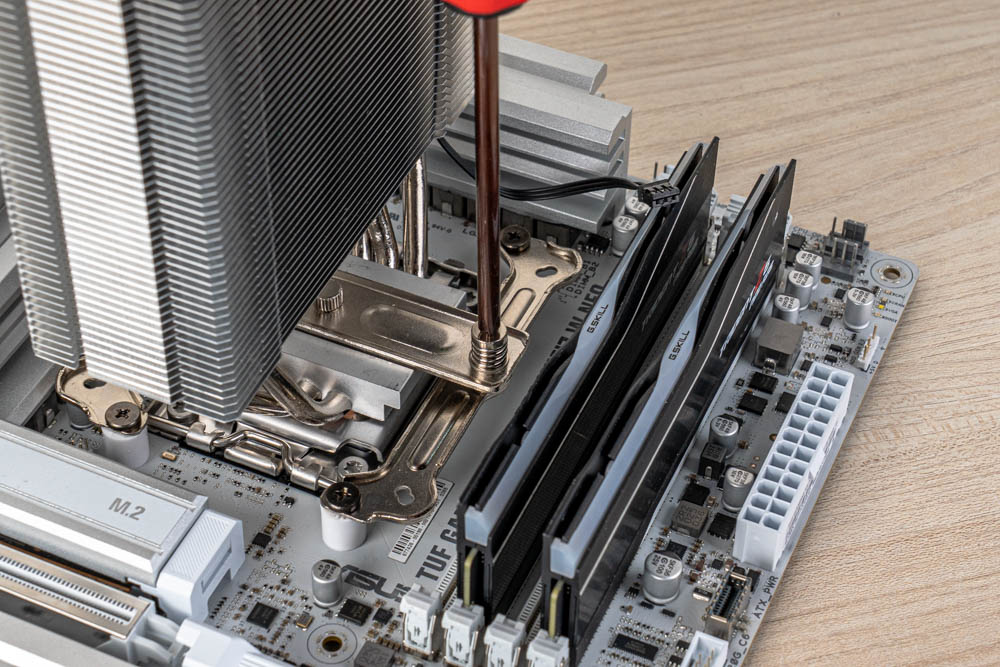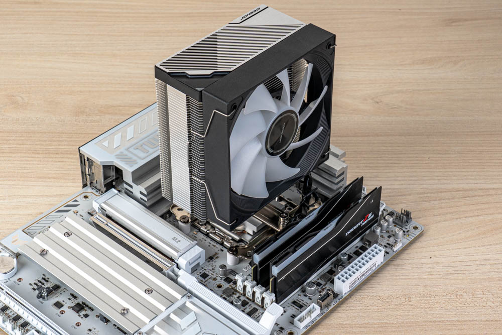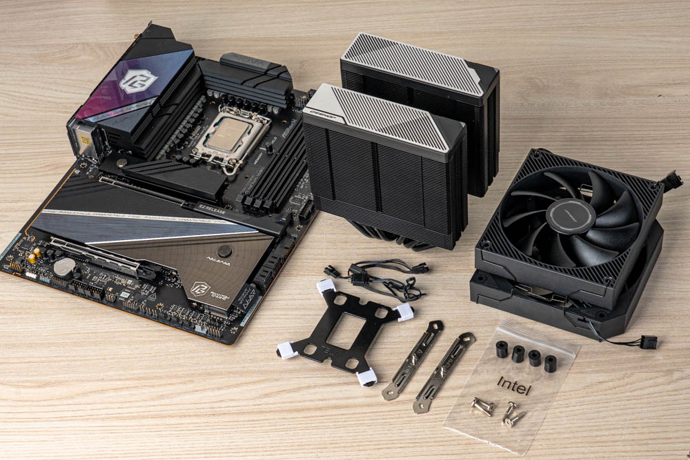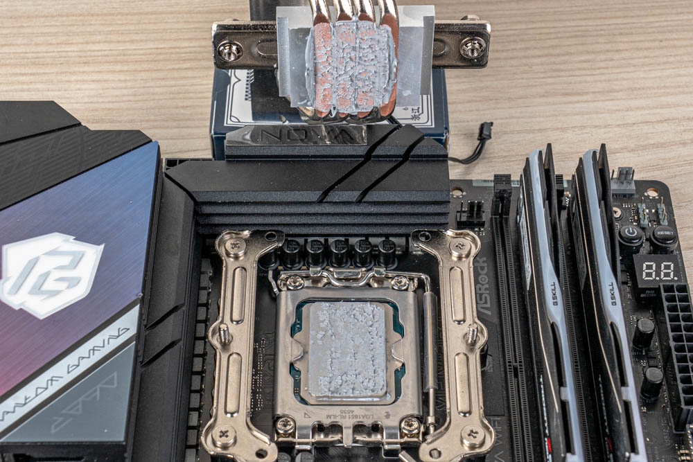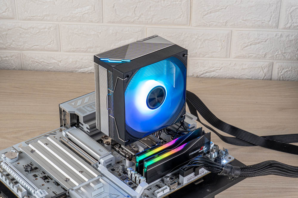 最後使用出廠隨附的 TG-7 散熱膏,點塗於CPU頂蓋,再接續壓上散熱器,將貫穿式扣具的兩邊彈簧螺絲鎖固,完成塔體安裝;最後依序接線與裝上風扇,即可完成整個散熱器安裝。
