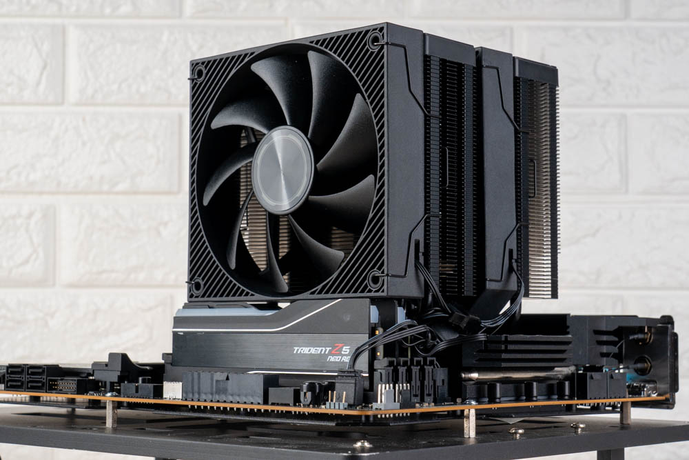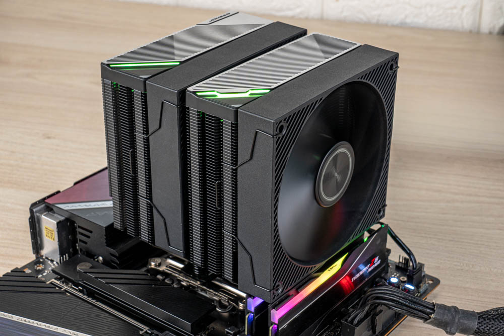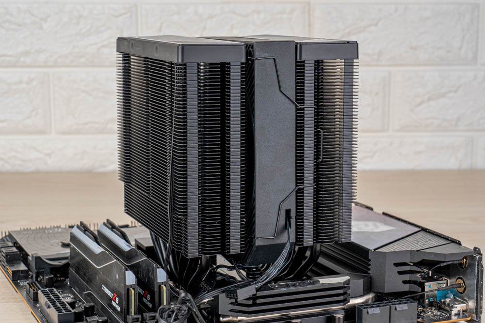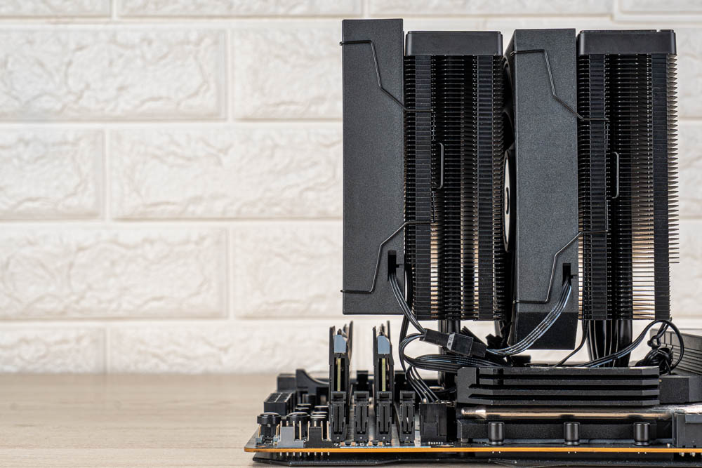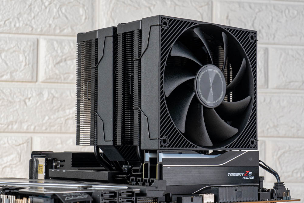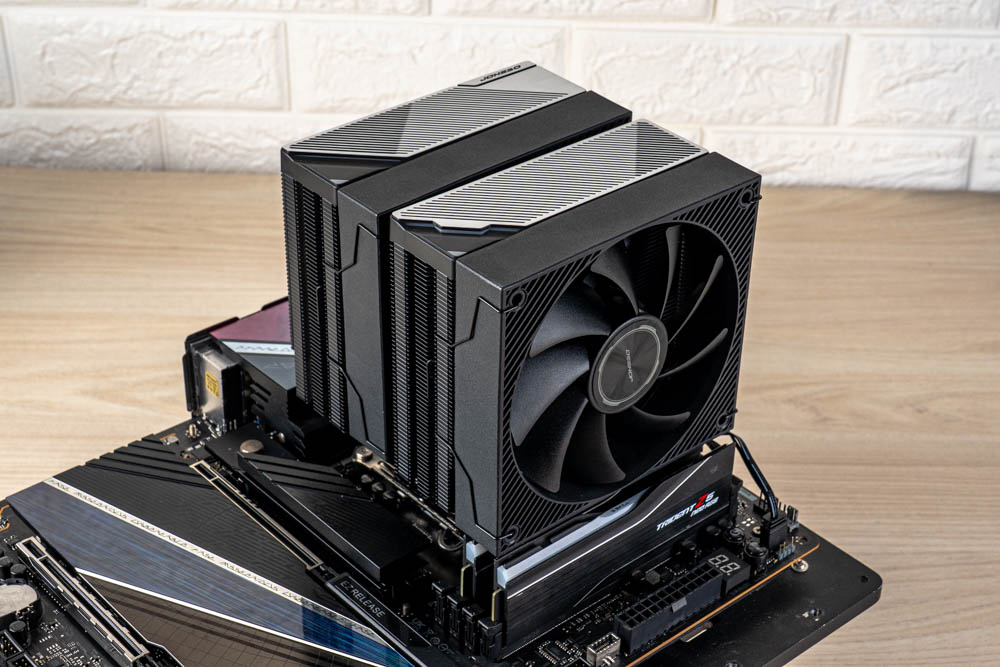 豎立於中間 C 位,即為旗艦款 CA90 雙塔風冷散熱器,相較前兩者,有著黑化金屬的深邃外觀,並且塔體與貫穿式扣具,包含鍍鎳熱導管、散熱鰭片,皆採用黑化塗層處理,可帶來更好的抗氧化能力;還將原本前置 ARGB 風扇搭配,改為限定造型的黑色風扇,讓整體視覺性更為一致。