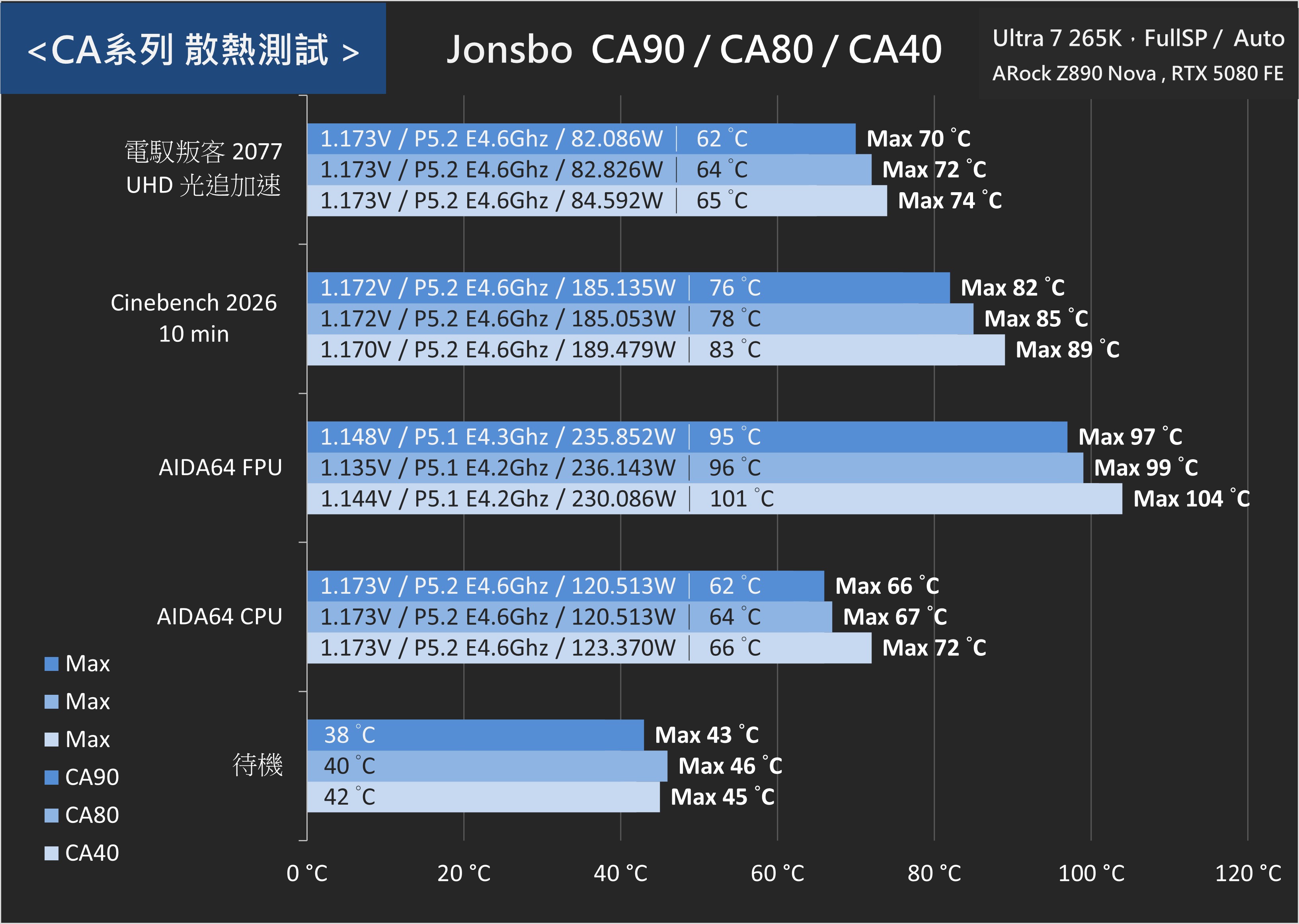 CA系列散熱器,在使用 Ultra 7 265K 實測;各自待機情況為 CA90 43°C、CA80 46°C、CA40 45°;緊接著 AIDIA64 CPU 壓力測試 CA90 66°C、CA80 67°C、CA40 72°C;而壓力最大AIDIA64 FPU測試下,提升至CA90 97°C / 平均 95°C、CA80 99°C / 平均 95°C、CA40 104°C / 平均 101°C,此時 265K 熱功耗來到 CA90 235.8W、CA80 236.1W、CA40 230.1W,接近 250W 預設功耗。
