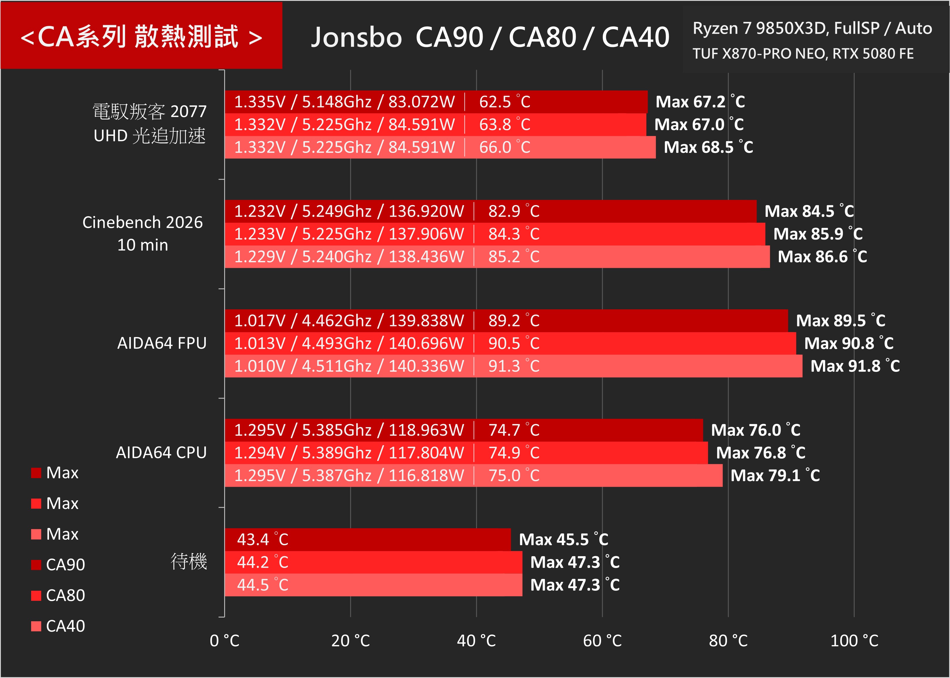 ↑ JONSBO CA系列風冷,CA40、CA80、CA90 散熱測試 (AMD)。
