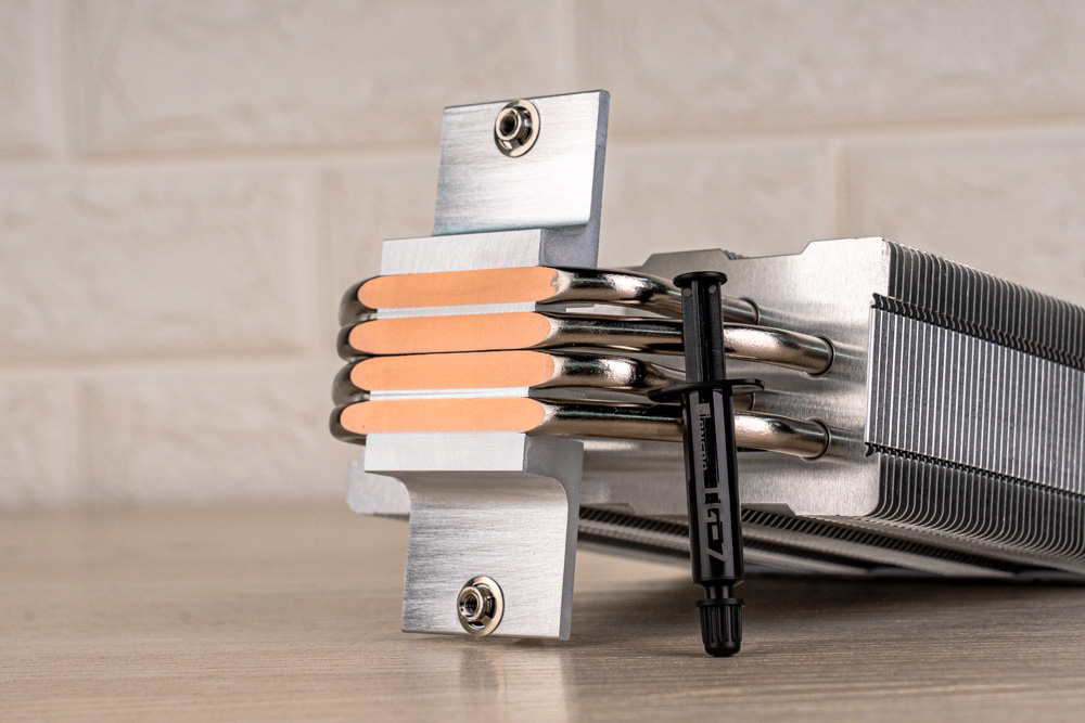 ↑ 散熱底座,採用熱管直觸設計,搭配貫穿式扣具,並隨附有 1 管 TG-7 散熱膏。