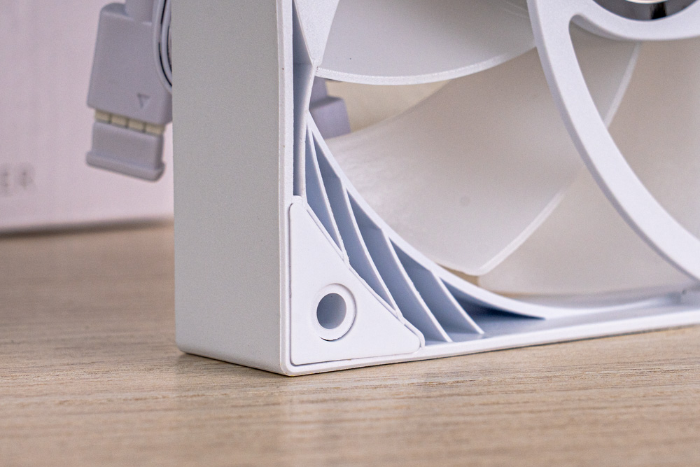 塔體配置一顆 120mm ARGB 風扇,可供最大轉速 1800 RPM、風量 77.07 CFM、風壓 1.86 mmH2O,以及噪音值 35.4 dB-A;並且風扇背面,設有防震橡膠墊於外框四邊角,可減輕風扇高速運轉的回饋震動。