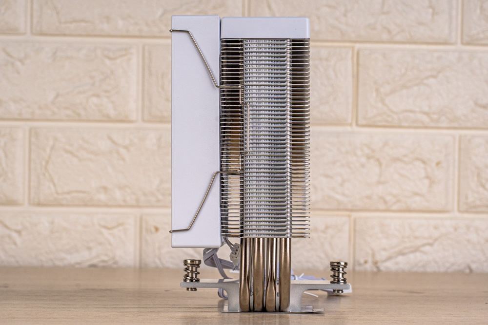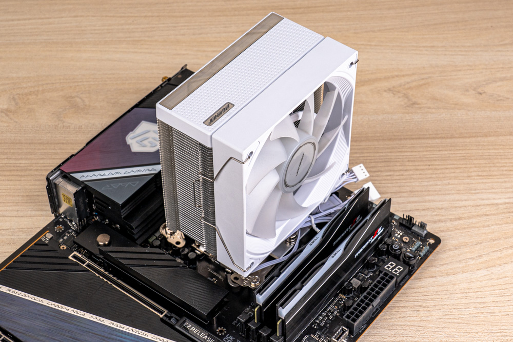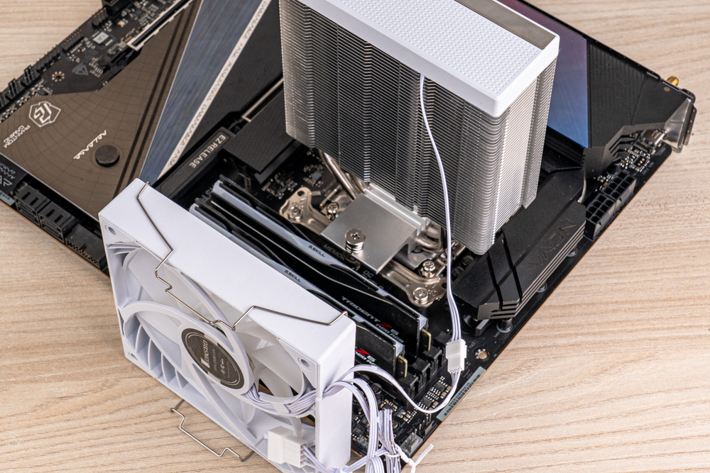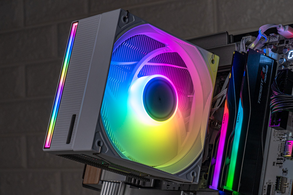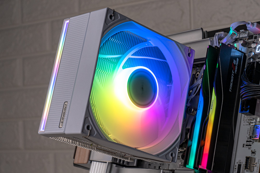 風扇方面,配有 1 顆 120mm ARGB 風扇,可提供最大轉速 1800 RPM、風量 77.07 CFM 與風壓 1.86 mmH2O 的風扇性能,可確保氣流快速穿透散熱鰭片;並與塔體相互配合,整體解熱能力可高達 225W TDP;此外,風扇外觀也會依據配色款式,分有黑與白兩色版本。