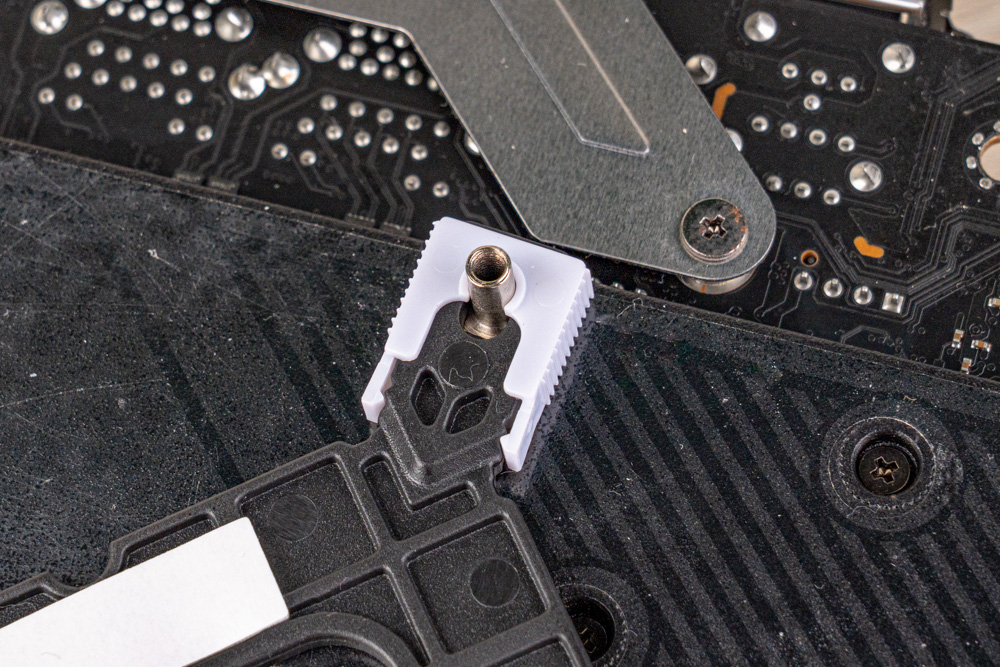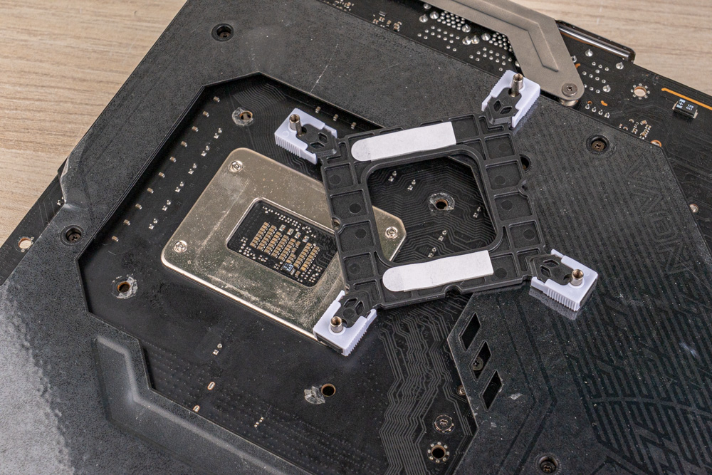 Intel 平台,安裝初步是把Intel扣具專用的背板,嵌入於主機板背面,並留意背板的孔距段位,需調為1851/1700段位;接者放上對應腳位的黑色套筒,搭配 4 顆長螺絲,將扣具支架鎖固處理,即可完成初步的扣具安裝。