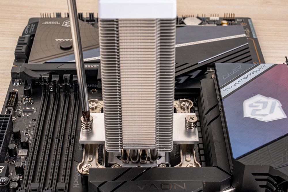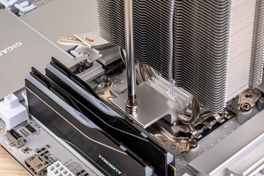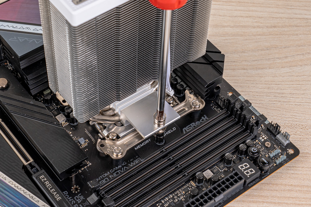 隨後出廠附的 TG-7 散熱膏,點塗於 CPU 頂蓋,再壓上散熱器,將貫穿式扣具的兩邊彈簧螺絲,輪流交互鎖固,完成塔體安裝;最後裝上風扇,並確保頂蓋 ARGB 供電,與 ARGB 風扇相互串接,即可將供電連接於主板,完成 CB40 風冷散熱器安裝。