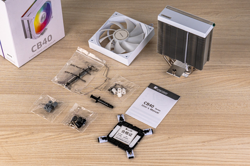↑ CB40 塔體、120mm ARGB 風扇與支架,以及各CPU 腳位扣具、TG-7 散熱膏等配件。
