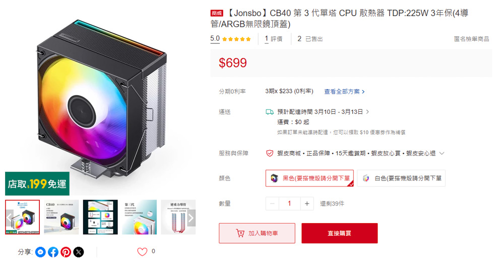 目前 JONSBO CB40 風冷散熱器,黑 / 白 兩色款式,官方售價皆為 699 元,這百元價位,可提供壓制入門、支援主流的處理器散熱效能,以及極具視覺性的ARGB 無限鏡頂蓋,並有著逆重力熱導管、貫穿式扣具、120mm高性能風扇等有料配置,對於預算有限,又想要視覺的DIY 玩家,CB系列可謂兩者兼具的優選之一。