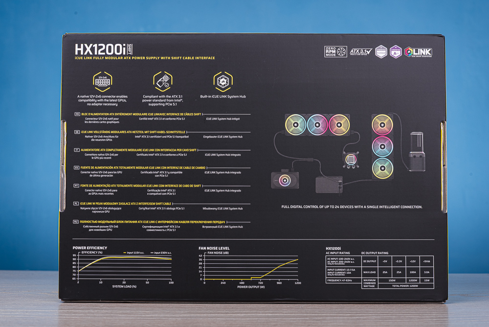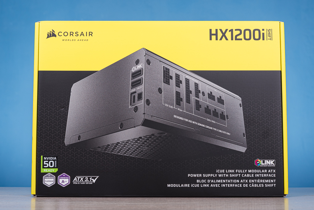 ↑ CORSAIR HX1200i SHIFT 外盒,有著 iCUE LINK、NVIDIA 50 系列、Cybenetics 等標誌。