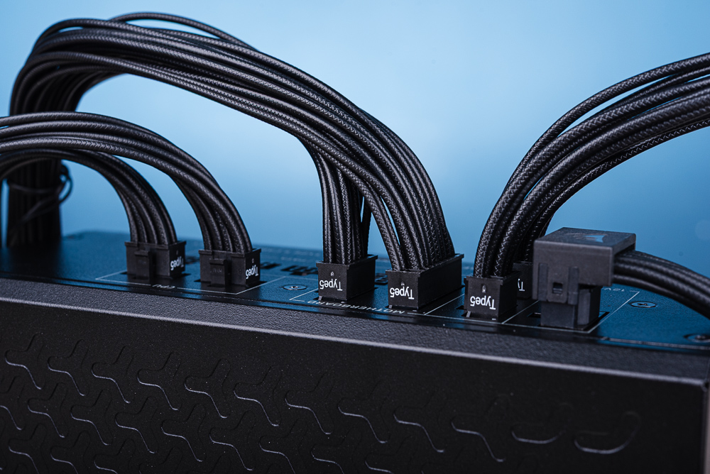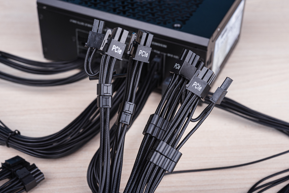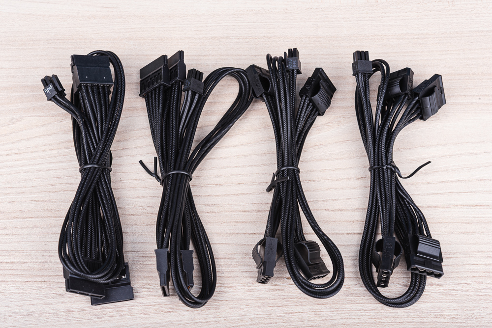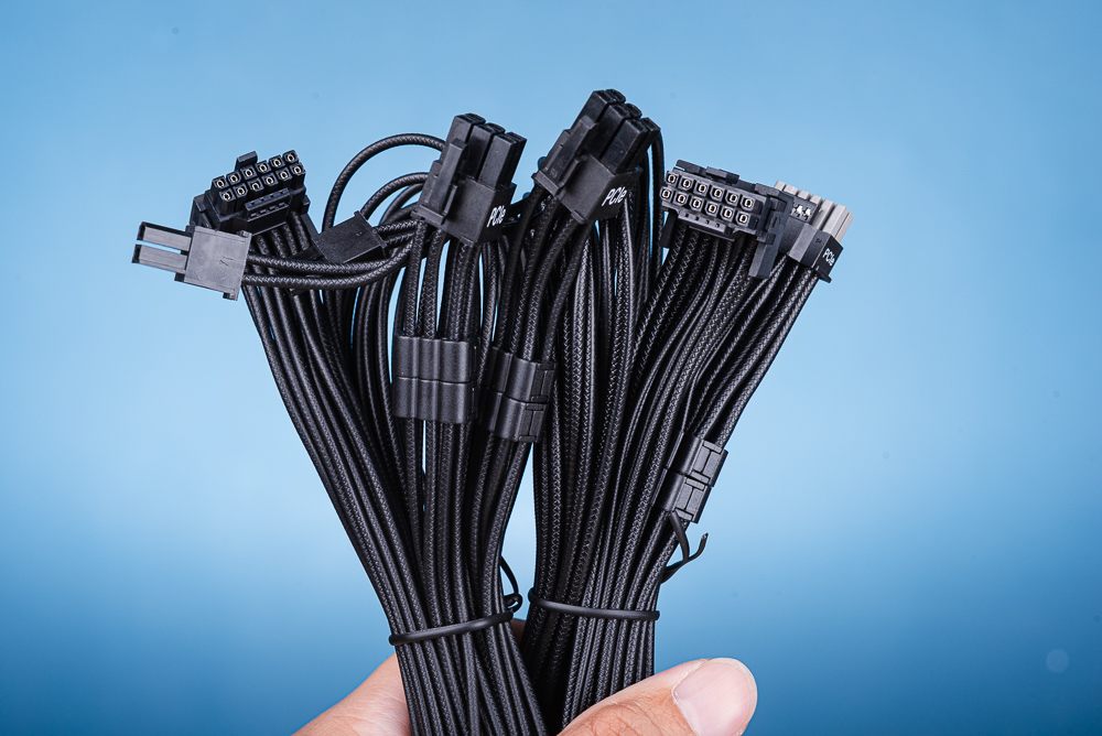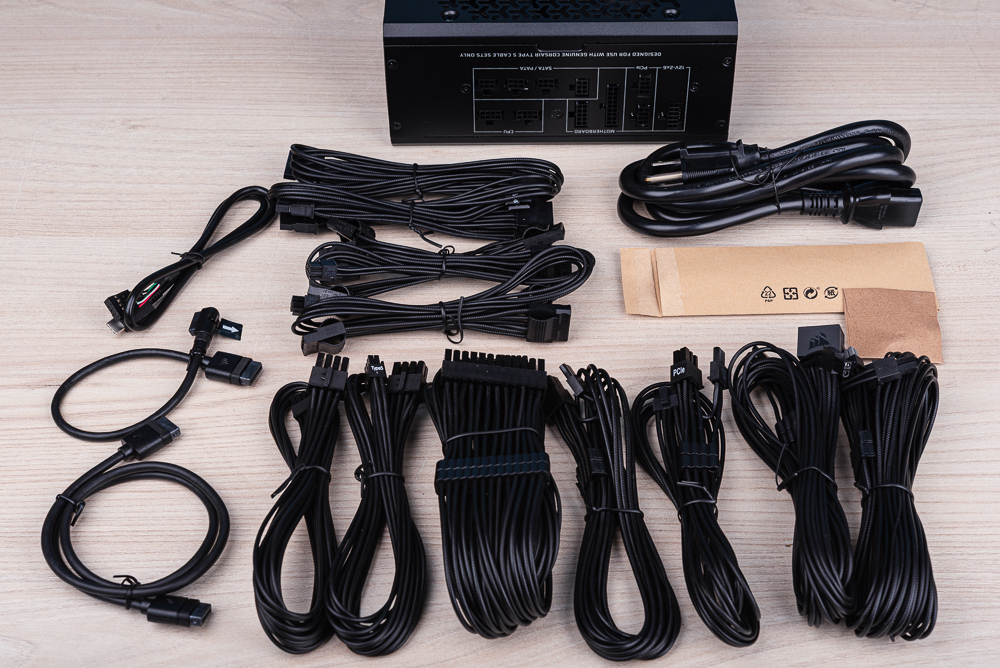 HX1200i SHIFT 電供搭配黑色壓紋模組線材,並且出廠時都具備線扣方便理線;除了 PCIe 12V-2×6 採用 Type 4 接頭外其餘模組端都使用 Type 5 接頭。主要的 MB 20+4 Pin 電源線長度為 610mm;並提供 2 條 CPU 4+4 Pin、650mm 長度。