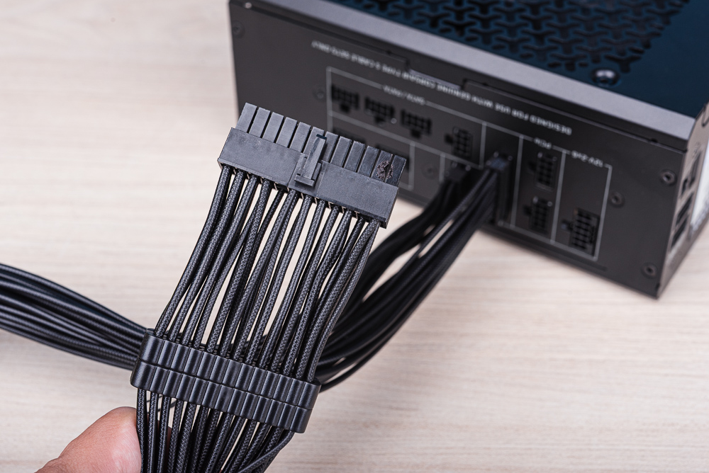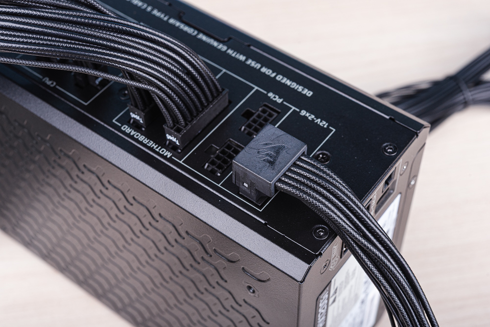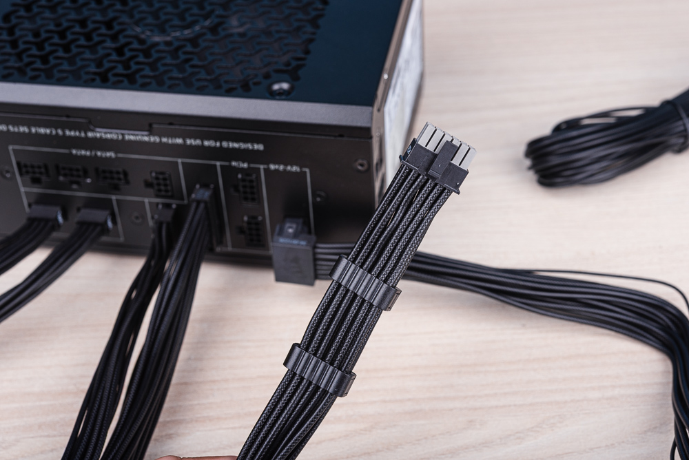 此外,海盜船在 MB 24 pin、CPU 8 pin、PCIe 6+2 pin、SATA / PATA 等模組接頭端,採用 Type 5 的小巧端子,而原生 PCIe 12V-2×6 則使用目前主流的 Type 4 接頭。實際安裝發現,海盜船將 Type 5 的端子設計的非常緊實,意味著組裝模組線時需要稍微用力把端子插入,這樣才能確保電供安裝後玩家整理線材時不會將模組接頭微微拔起。