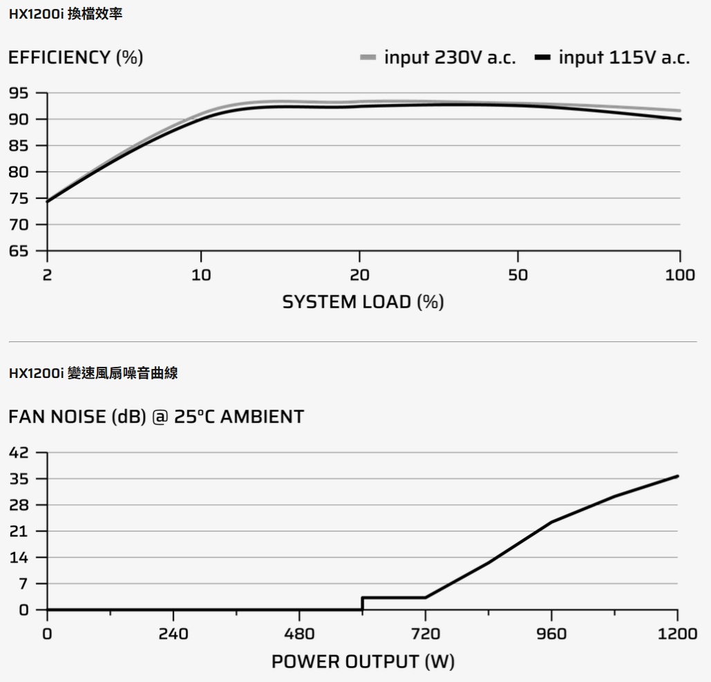 海盜船提到 HX1200i SHIFT 的風扇噪音曲線設定為,電供功耗在 500W 以下時會自動停轉風扇,500W 以上會依據負載提升轉速;而轉換效率方面,基本上系統負載超過 10% 小於 99% 這段可維持 90% 以上的轉換效率。