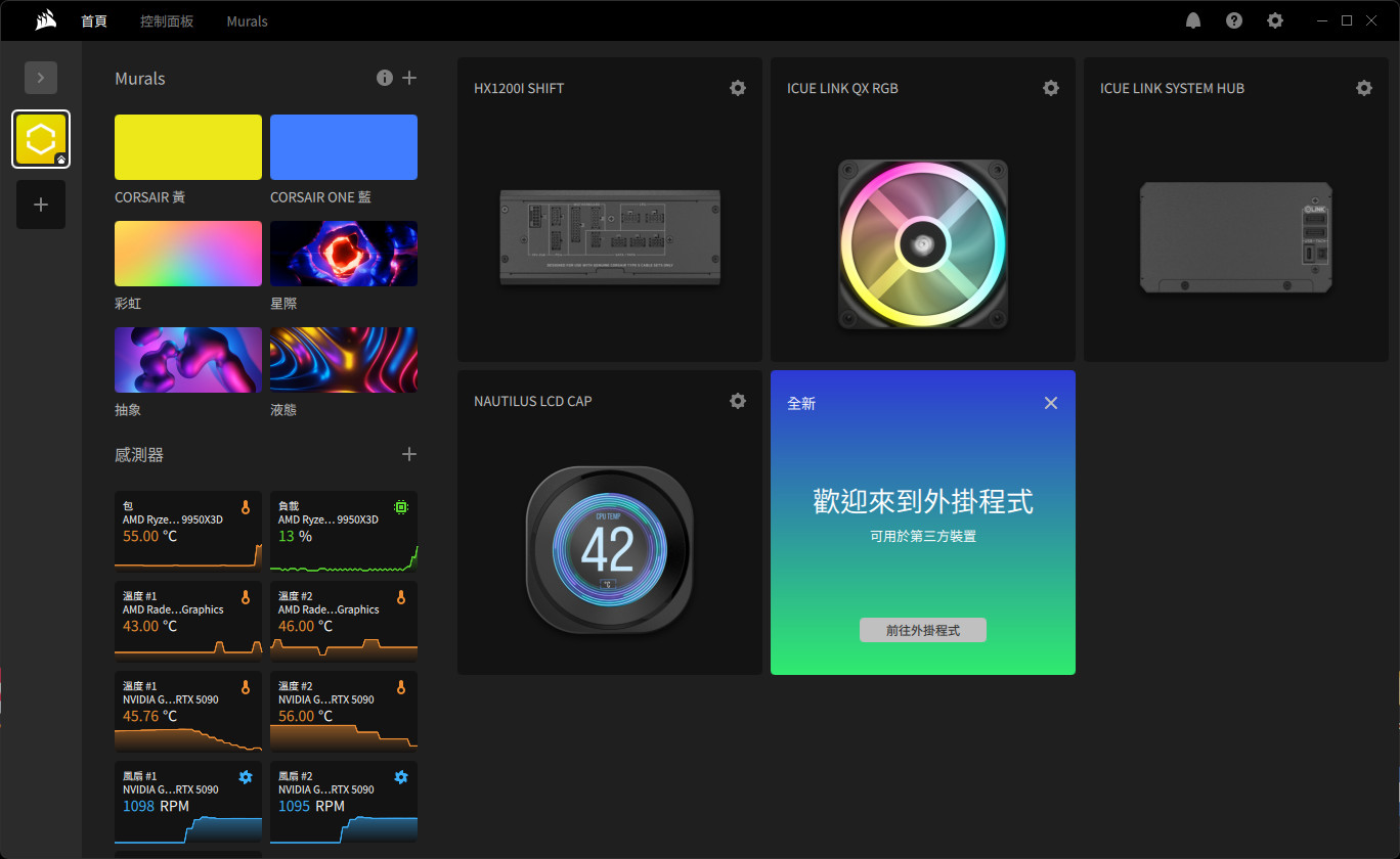 玩家安裝好 iCUE 軟體會在首頁看到 HX1200i SHIFT、ICUE LIN QX RGB、ICUE LINK HUB、NAUTILUS LCD CAP 等裝置,以及手動色彩調整、感測器等基本資訊。點及各個裝置後即可針對個別裝置進行調整設定。